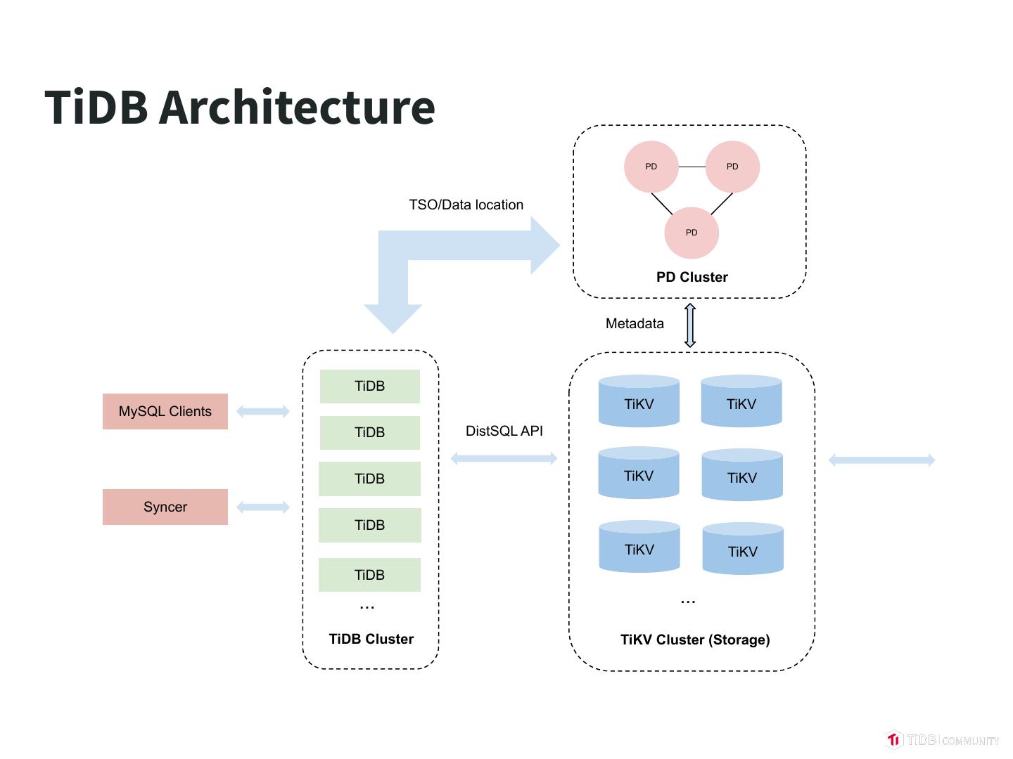 12 .TiDB Architecture PD PD TSO/Data location PD PD Cluster Metadata TiDB TiKV TiKV MySQL Clients TiDB DistSQL API TiDB TiKV TiKV Syncer TiDB TiKV TiKV TiDB ... ... TiDB Cluster TiKV Cluster (Storage)