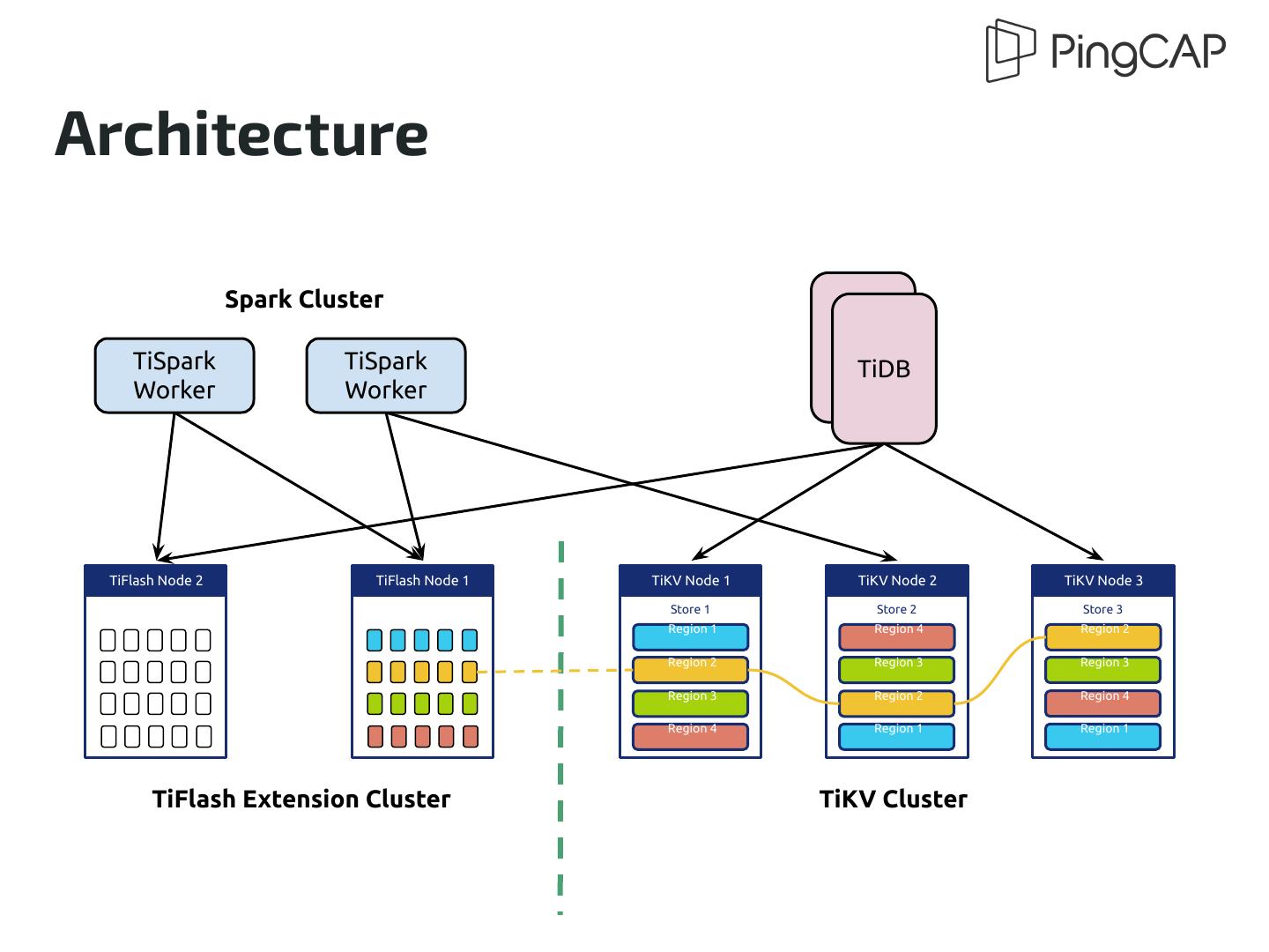 13 .Architecture Spark Cluster TiDB TiSpark TiSpark TiDB Worker Worker TiFlash Node 2 TiFlash Node 1 TiKV Node 1 TiKV Node 2 TiKV Node 3 Store 1 Store 2 Store 3 Region 1 Region 4 Region 2 Region 2 Region 3 Region 3 Region 3 Region 2 Region 4 Region 4 Region 1 Region 1 TiFlash Extension Cluster TiKV Cluster