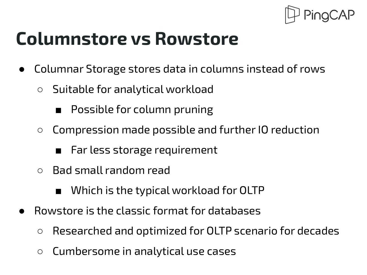 14 .Columnstore vs Rowstore ● Columnar Storage stores data in columns instead of rows ○ Suitable for analytical workload ■ Possible for column pruning ○ Compression made possible and further IO reduction ■ Far less storage requirement ○ Bad small random read ■ Which is the typical workload for OLTP ● Rowstore is the classic format for databases ○ Researched and optimized for OLTP scenario for decades ○ Cumbersome in analytical use cases