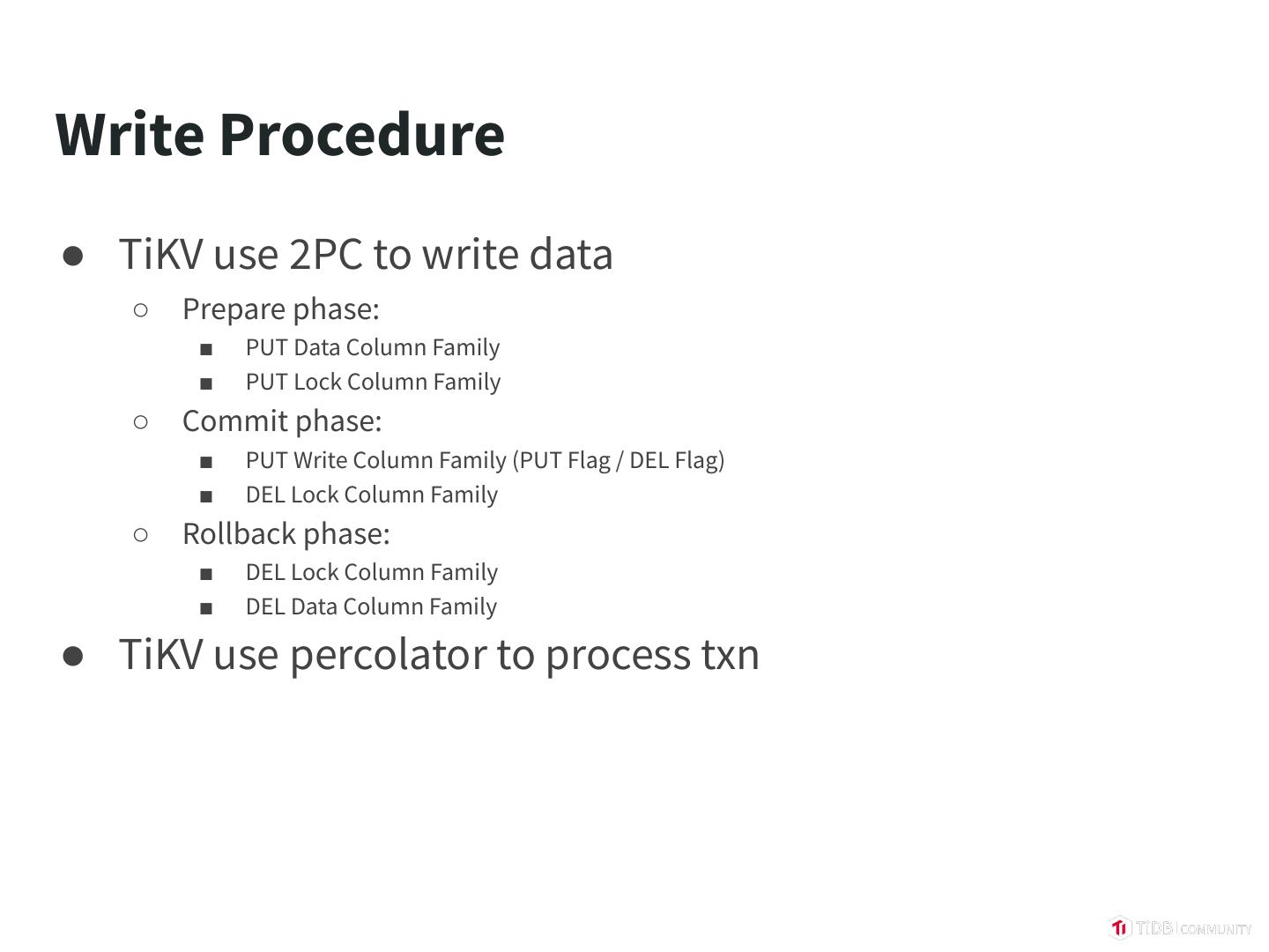 23 .Write Procedure ● TiKV use 2PC to write data ○ Prepare phase: ■ PUT Data Column Family ■ PUT Lock Column Family ○ Commit phase: ■ PUT Write Column Family (PUT Flag / DEL Flag) ■ DEL Lock Column Family ○ Rollback phase: ■ DEL Lock Column Family ■ DEL Data Column Family ● TiKV use percolator to process txn