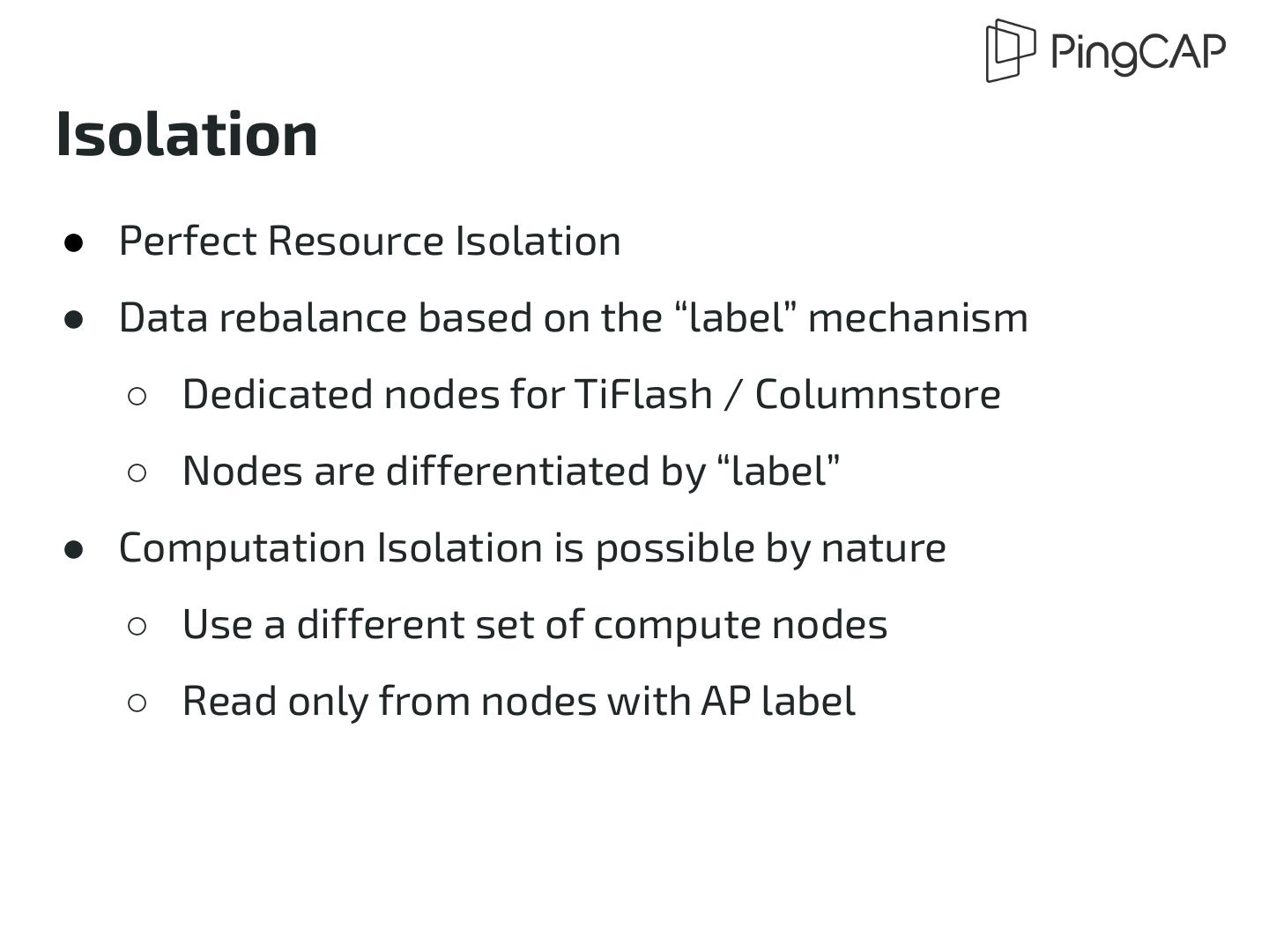 17 .Low-cost Data Replication ● TiDB replicates log via Raft consensus protocol ● TiFlash replicates data in columnstore via Raft Learner ● Learner is a special read-only role in Raft ● Data is replicated to learner asynchronously ○ Write operation does not wait for learner finish replicating data ● Introduce very low latency for the OLTP workload