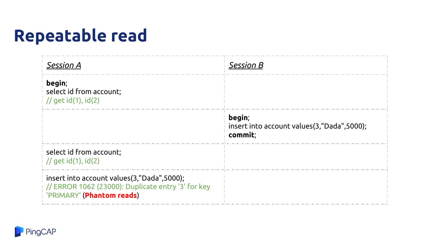 11 .Repeatable read Session A Session B begin; select id from account; // get id(1), id(2) begin; insert into account values(3,"Dada",5000); commit; select id from account; // get id(1), id(2) insert into account values(3,"Dada",5000); // ERROR 1062 (23000): Duplicate entry '3' for key 'PRIMARY' (Phantom reads)