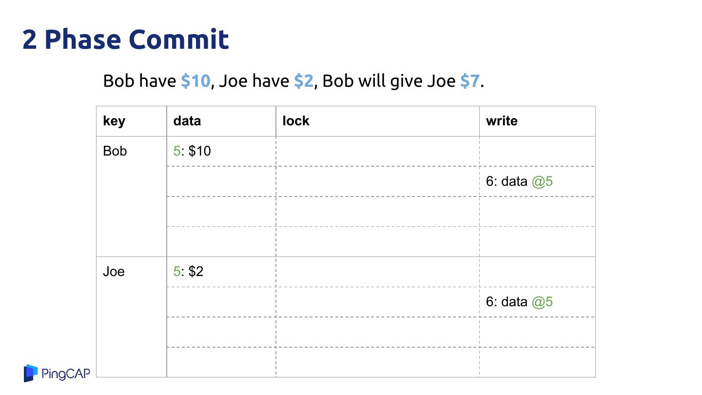 16 .2 Phase Commit Bob have $10, Joe have $2, Bob will give Joe $7. key data lock write Bob 5: $10 6: data @5 Joe 5: $2 6: data @5