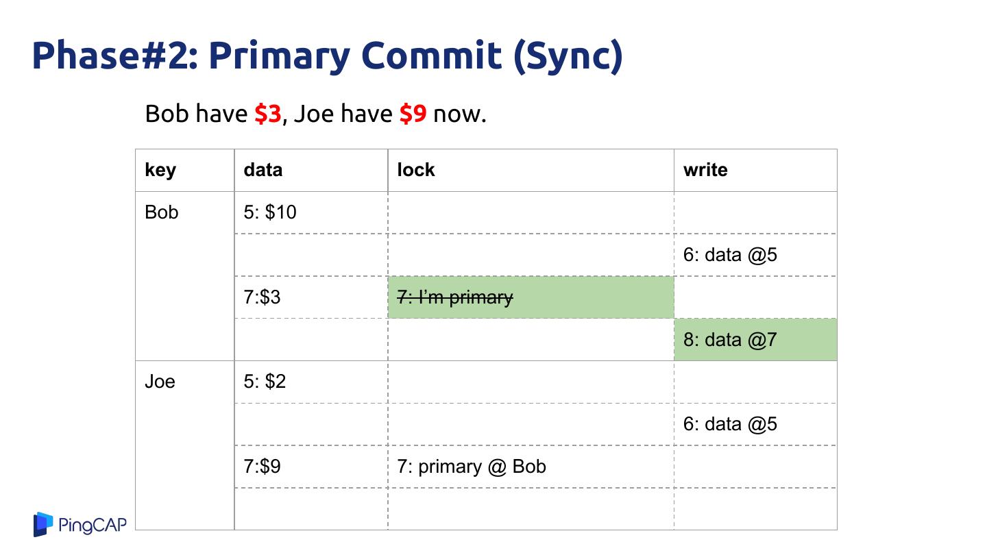 17 .Phase#1 : Prewrite key data lock write Bob 5: $10 6: data @5 7:$3 7:I’m primary Joe 5: $2 6: data @5 7:$9 7:primary @ Bob