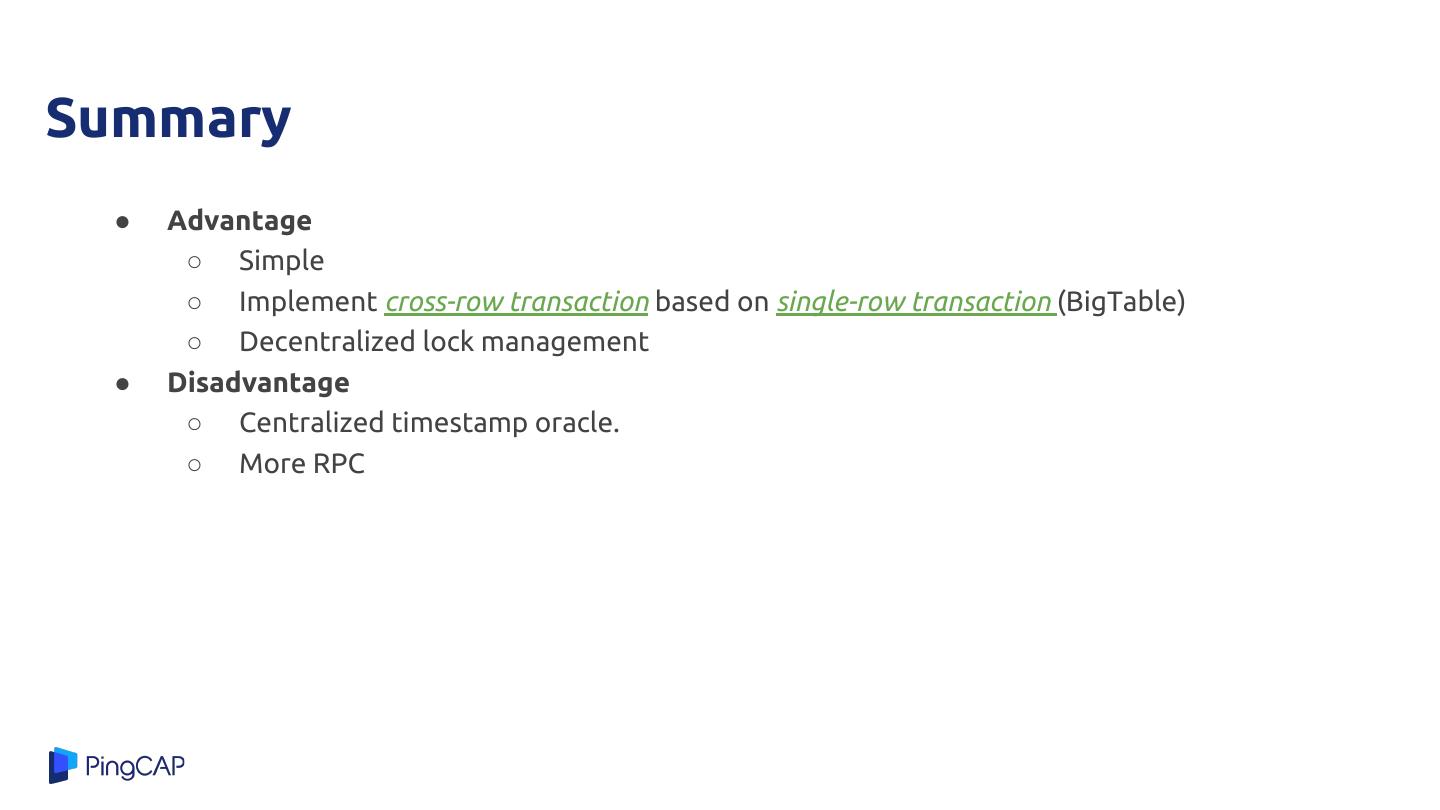 20 .Summary ● Advantage ○ Simple ○ Implement cross-row transaction based on single-row transaction (BigTable) ○ Decentralized lock management ● Disadvantage ○ Centralized timestamp oracle. ○ More RPC