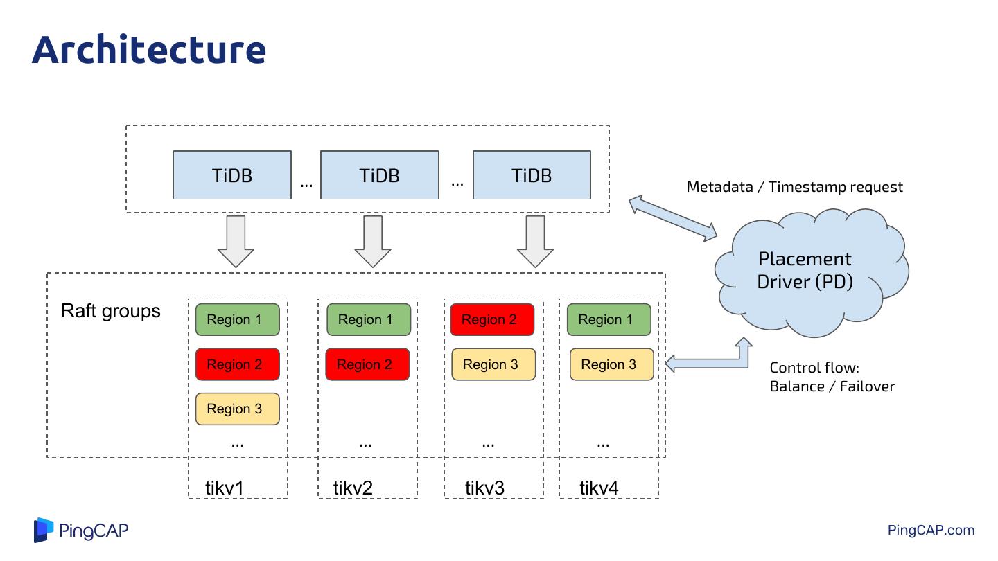 22 .Architecture TiDB ... TiDB ... TiDB Metadata / Timestamp request Placement Driver (PD) Raft groups Region 1 Region 1 Region 2 Region 1 Region 2 Region 2 Region 3 Region 3 Control flow: Balance / Failover Region 3 ... ... ... ... tikv1 tikv2 tikv3 tikv4 PingCAP.com