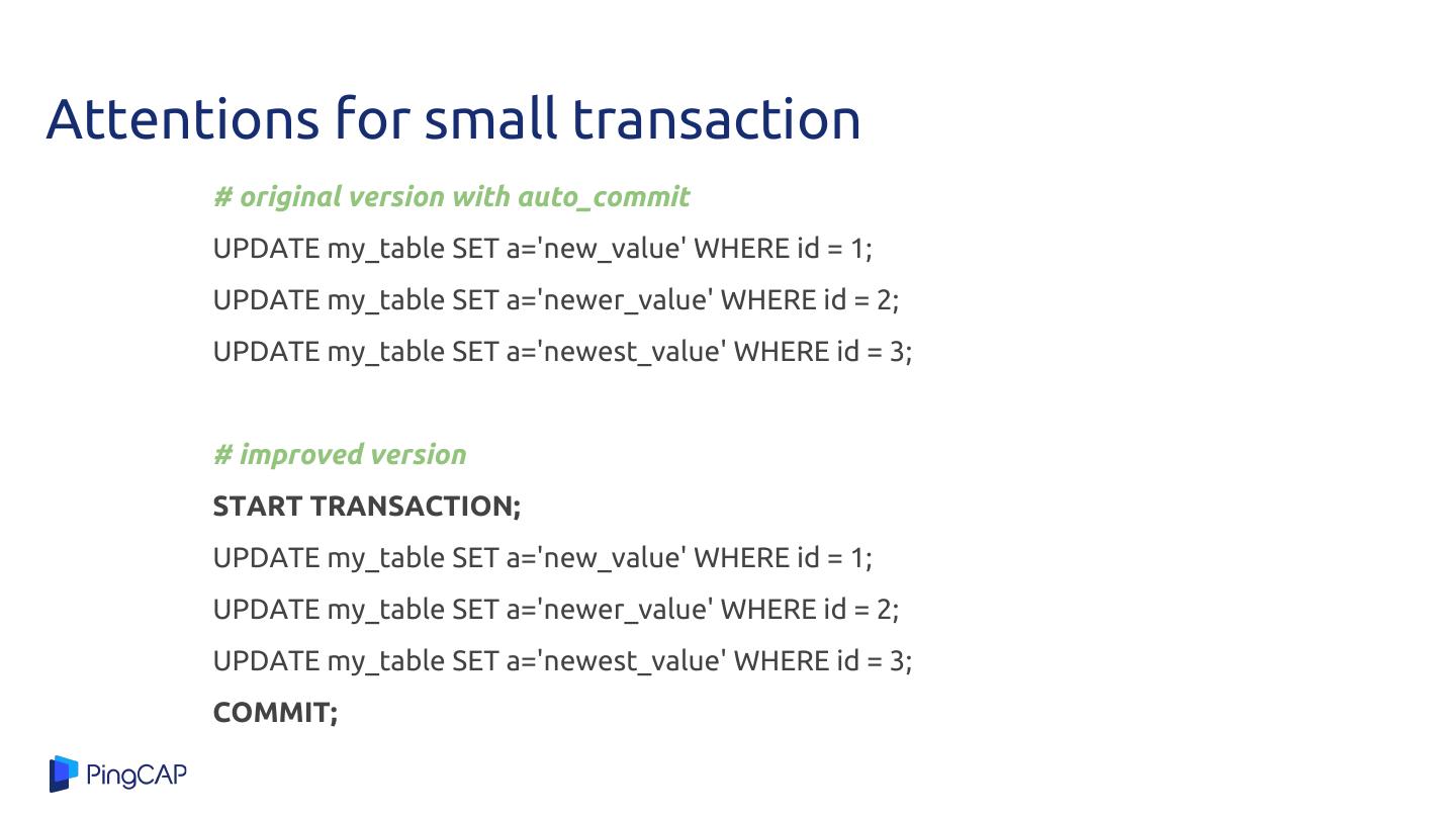 29 .Attentions for large transaction Due to the distributed, 2-phase commit requirement of TiDB, large transactions that modify data can be particularly problematic: ● Long duration ● More conflicts ● And so on ... TiDB intentionally sets some limits on transaction sizes to reduce this impact: ● Each Key-Value entry is no more than 6MB ● The total number of Key-Value entries is no more than 300,000 ● The total size of Key-Value entries is no more than 100MB
