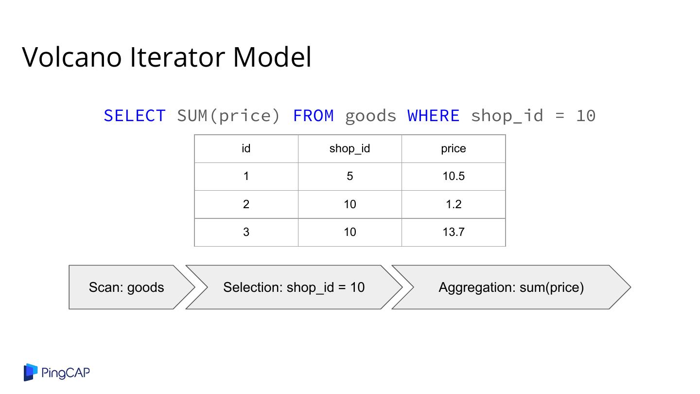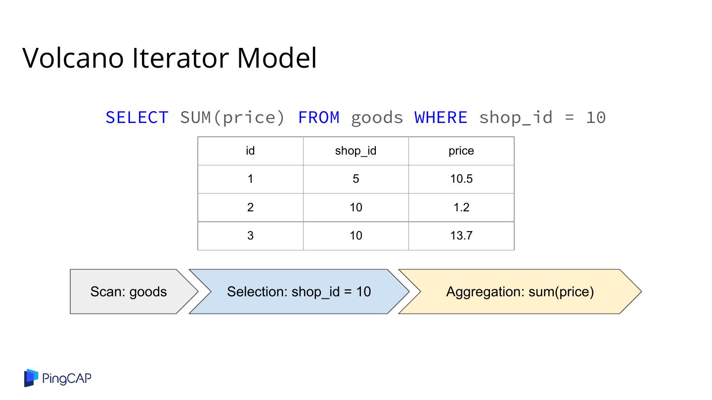 16 .Volcano Iterator Model SELECT SUM(price) FROM goods WHERE shop_id = 10 id shop_id price 1 5 10.5 2 10 1.2 3 10 13.7 Scan: goods Selection: shop_id = 10 Aggregation: sum(price)