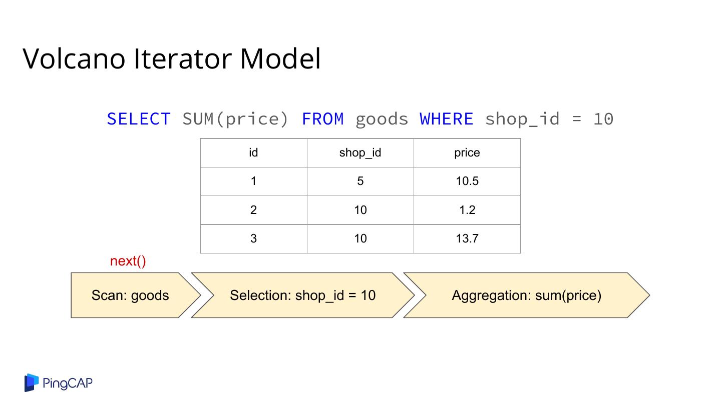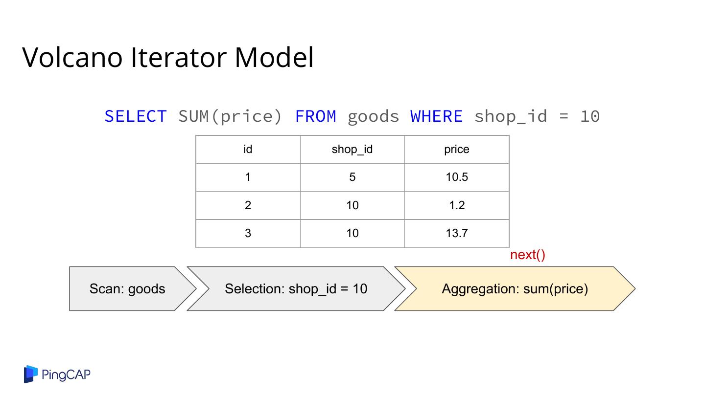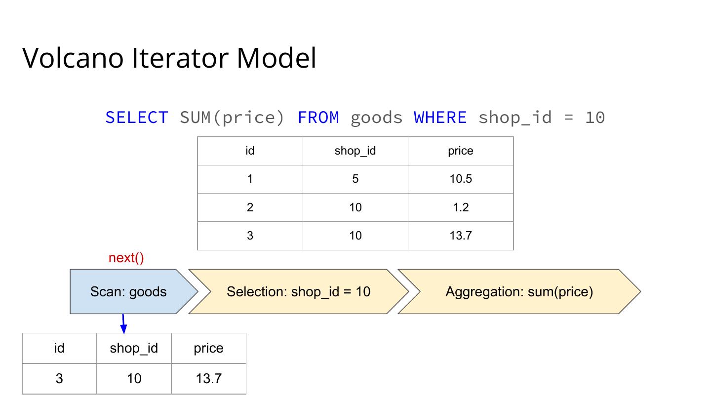 12 .Volcano Iterator Model SELECT SUM(price) FROM goods WHERE shop_id = 10 id shop_id price 1 5 10.5 2 10 1.2 3 10 13.7 next() Scan: goods Selection: shop_id = 10 Aggregation: sum(price)