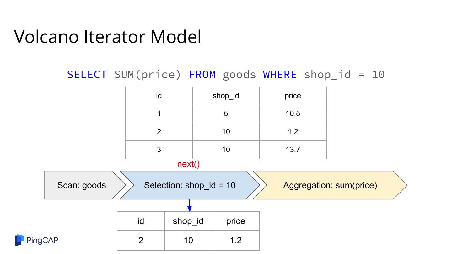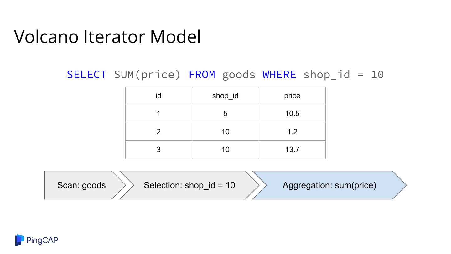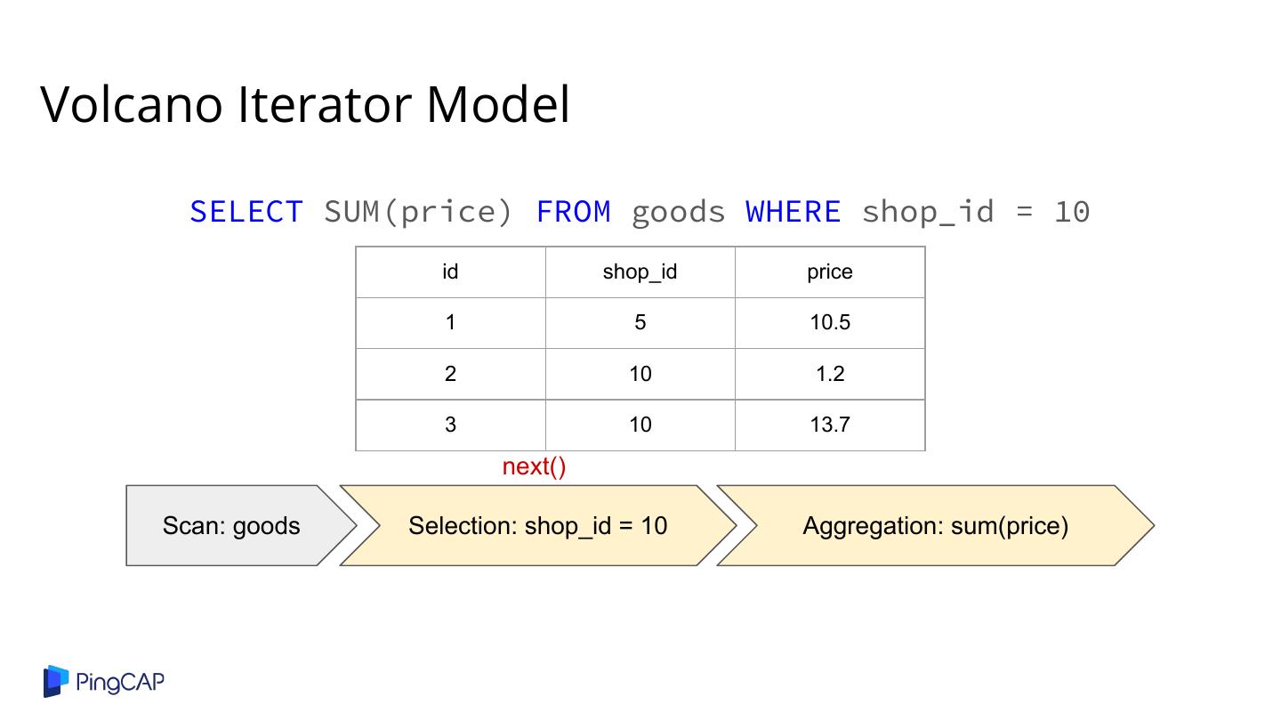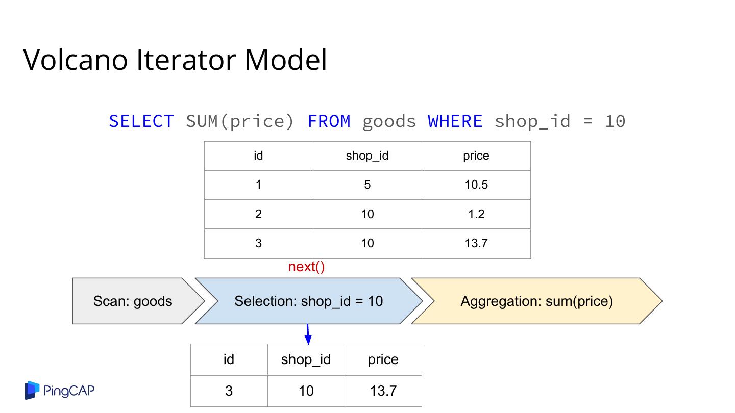 12 .Volcano Iterator Model SELECT SUM(price) FROM goods WHERE shop_id = 10 id shop_id price 1 5 10.5 2 10 1.2 3 10 13.7 next() Scan: goods Selection: shop_id = 10 Aggregation: sum(price)