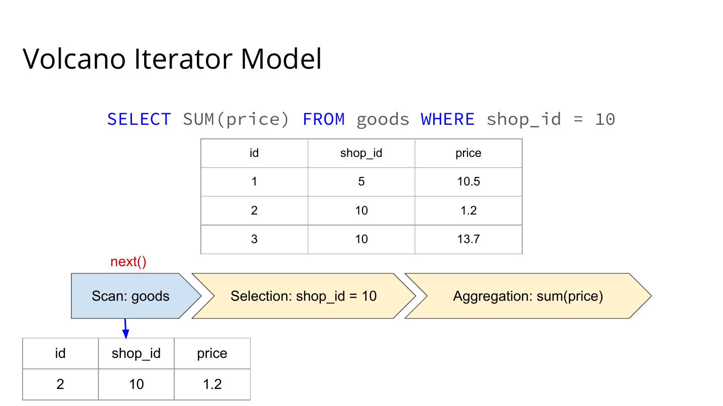 21 .Volcano Iterator Model SELECT SUM(price) FROM goods WHERE shop_id = 10 id shop_id price 1 5 10.5 2 10 1.2 3 10 13.7 next() Scan: goods Selection: shop_id = 10 Aggregation: sum(price)