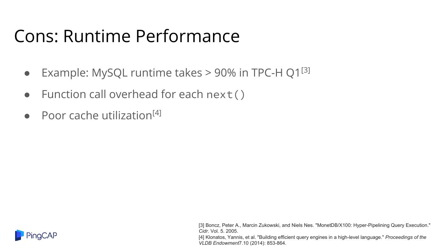 27 .Cons: Runtime Performance ● Example: MySQL runtime takes > 90% in TPC-H Q1[3] ● Function call overhead for each next() ● Poor cache utilization[4] [3] Boncz, Peter A., Marcin Zukowski, and Niels Nes. "MonetDB/X100: Hyper-Pipelining Query Execution." Cidr. Vol. 5. 2005. [4] Klonatos, Yannis, et al. "Building efficient query engines in a high-level language." Proceedings of the VLDB Endowment7.10 (2014): 853-864.