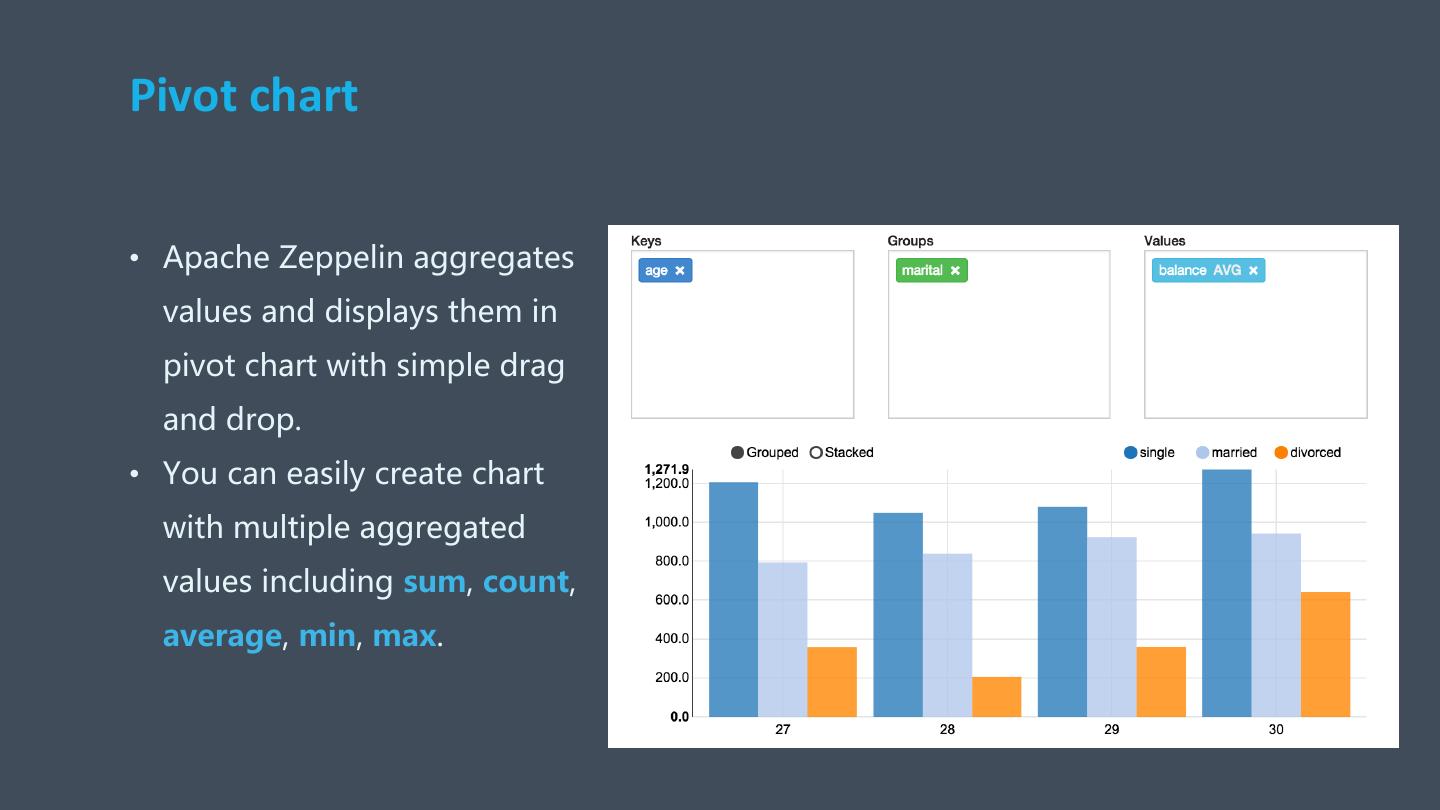 7 .Pivot chart • Apache Zeppelin aggregates values and displays them in pivot chart with simple drag and drop. • You can easily create chart with multiple aggregated values including sum, count, average, min, max.