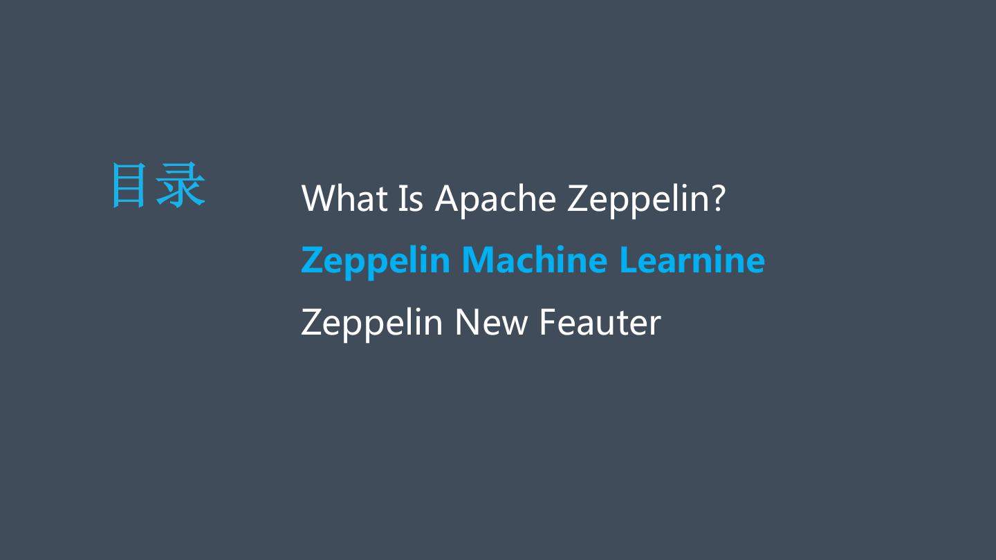 3 .目录 What Is Apache Zeppelin? Zeppelin Machine Learnine Zeppelin New Feauter