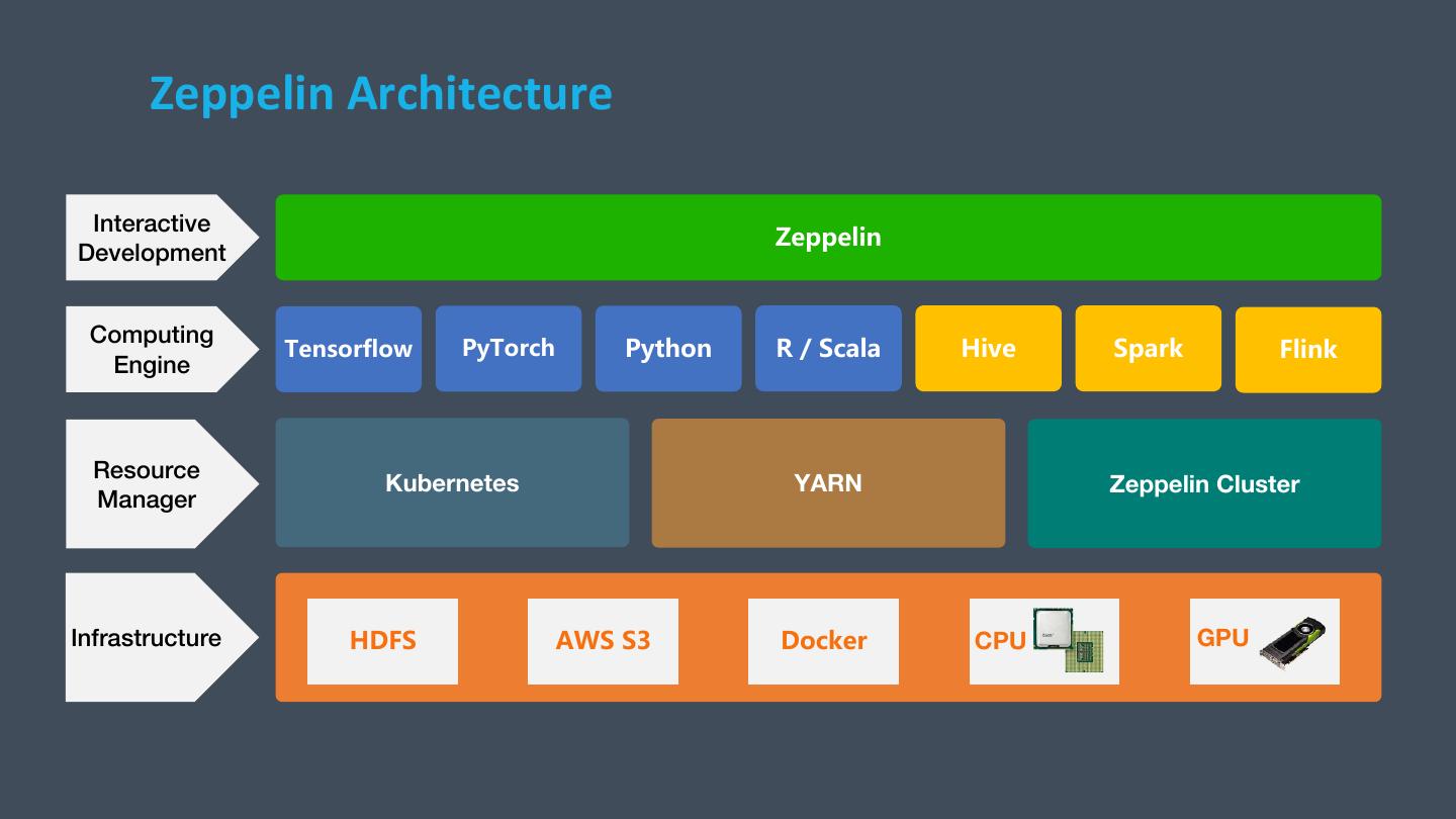 11 . Zeppelin Architecture Interactive Zeppelin Development Computing Tensorflow PyTorch Python R / Scala Hive Spark Flink Engine Resource Kubernetes YARN Zeppelin Cluster Manager Infrastructure HDFS AWS S3 Docker CPU GPU