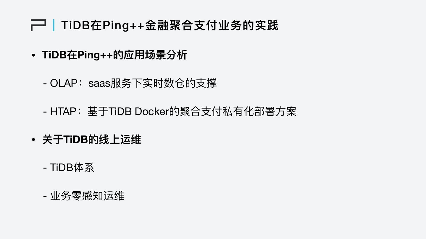 3 . TiDB在Ping++⾦金金融聚合⽀支付业务的实践 • TiDB在Ping++的应⽤用场景分析 - OLAP:saas服务下实时数仓的⽀支撑 - HTAP:基于TiDB Docker的聚合⽀支付私有化部署⽅方案 • 关于TiDB的线上运维 - TiDB体系 - 业务零感知运维