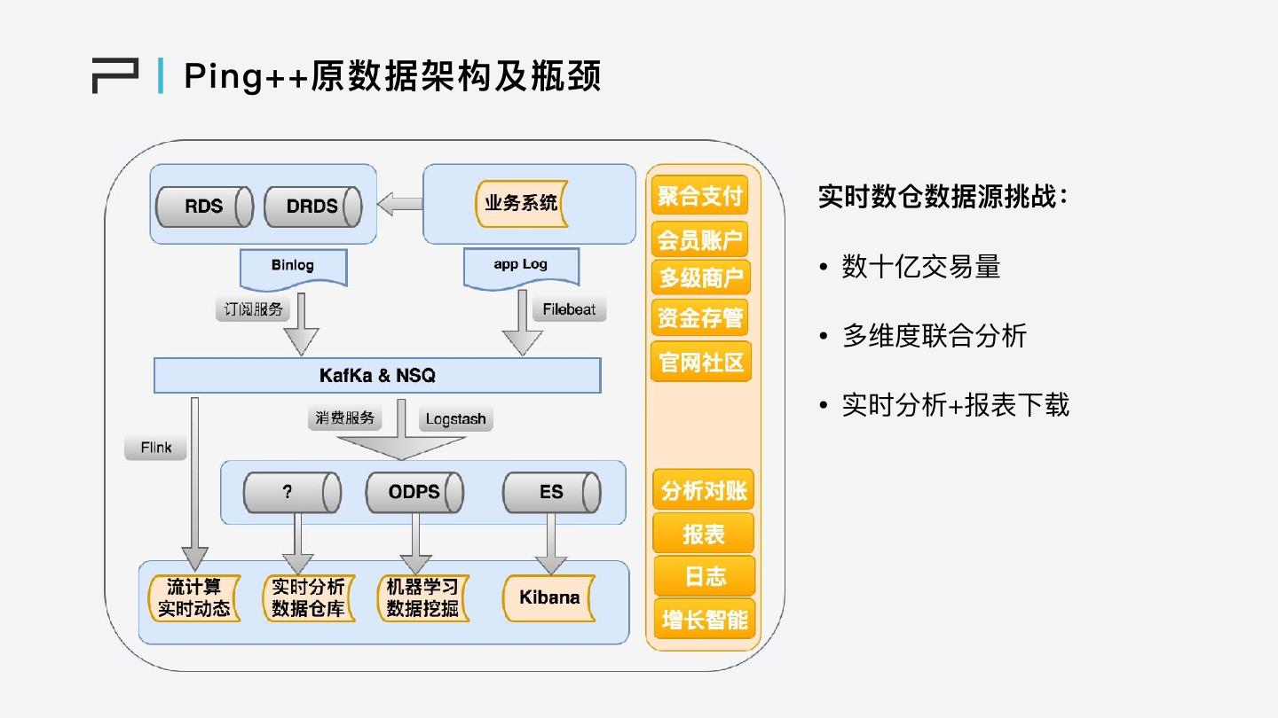 4 .Ping++原数据架构及瓶颈 实时数仓数据源挑战: • 数⼗十亿交易易量量 • 多维度联合分析 • 实时分析+报表下载