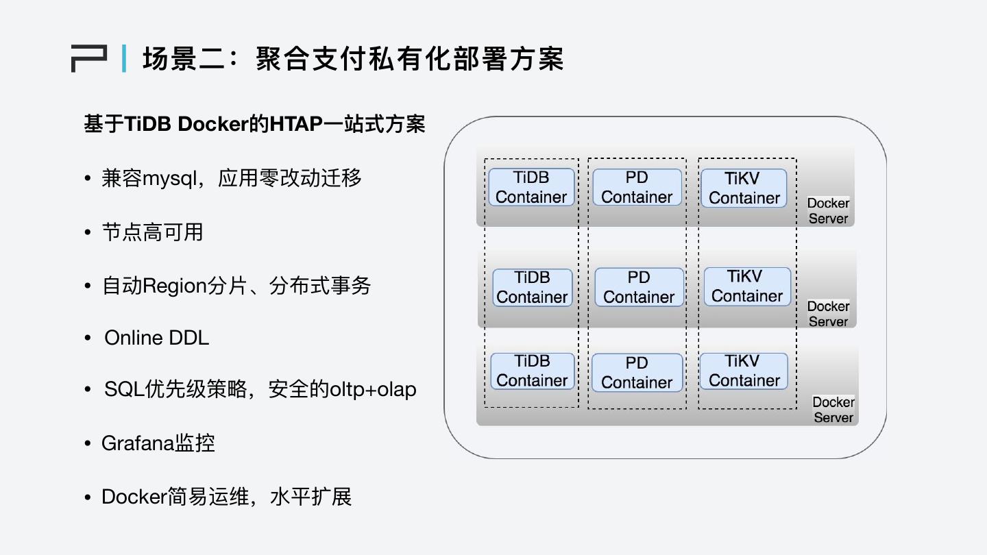 8 . 场景⼆二:聚合⽀支付私有化部署⽅方案 基于TiDB Docker的HTAP⼀一站式⽅方案 • 兼容mysql,应⽤用零改动迁移 • 节点⾼高可⽤用 • ⾃自动Region分⽚片、分布式事务 • Online DDL • SQL优先级策略略,安全的oltp+olap • Grafana监控 • Docker简易易运维,⽔水平扩展