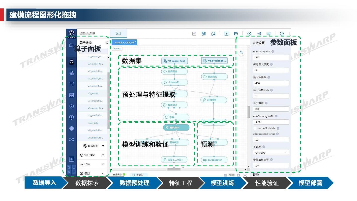 17 .分布式并行计算框架——集合百余种金融数据处理算子 HDFS(ORC、Parquet等数据格式)、HBase、ES、本地文件(csv、json等数 基础能力:支持多种优化算法包括Parallel SGD以及FTRL。算法参数可配置。 数据接入 据格式)、MySQL、DB2、Oracle等。 特征权重:WOE、GINI、INFO、PCA等。 一元变量特征统计(均值、方差、类型数等)、二元变量特征统计(皮尔森 数据探索 预处理:PCA、SVD、DCT离散余弦变换、乔列斯基矩阵分解、LOF异常点检测 卡方、自由度等) 等。 数据清洗:缺失值填充(平均值、最大值、最小值、中位数等) 分类算法:逻辑回归、支持向量机SVM、朴素贝叶斯、决策树分类、随机森林 数据集成:支持包括数据库,文本,大数据平台在内各个数据源的数据集成, 分类、梯度提升树分类、KNN分类、多层感知机分类、Boost分类、基于 通过数据实体、属性对齐等方式构造统一的数据视图。 XGBoost的分类 数据变换:数据属性转换、新属性生成。 回归算法:线性回归、广义线性回归、决策树回归、随机森林回归、梯度提升 预处理 数据规约:数据属性的归一化工具(min-max归一化、标准归一化、max- 树回归、基于XGBoost的回归、保序回归、生存回归 abs归一化等 聚类算法:支持Kmeans,Dbscan,二分Kmeans、GMM等 自动化预处:自动填充数据、自动清理数据、自动数据转换以及自动数据归 关联规则:支持FP-Growth、PrefixSpan和Aprioi等 建模算法 一等。 推荐算法:支持ALS、FM因子分解机、ItemCF、UserCF等 基本特征转化:特征变换、特征重要性评估、特征选择、特征生成等,包括 时序分析:支持自回归AR、差分自回归移动平均过程ARIMA等 特征工程 且不限于归一化、标准化、离散化、one-hot编码等 深度学习:支持GPU可配置,包含多种神经层:Dense层、池化层、输入层、 自动化特征工程:自动特征变换、自动特征生成以及自动特征选择等。 输出层、卷积层、RNN层、LSTM层等 数据分割:按比例随机分配训练与测试集,交叉检验 自然语言处理:支持新词发现、分词、词频TF、逆文档词频IDF、命名实体识别、 分类评估:对于二分类,输出包括TP/TN/FP/FN的数目表格。对于多分类, Word2Vec、词库构建、LDA、词性标注、关键词抽取、自动摘要、情感分析、 模型评估 输出混淆矩阵 句子相似度、文档相似度、PSLA等 评估指标:KS、Lift、AUC、ROC、Precision、Weighted Recall、Recall、 图像处理:支持图片读取、图像展示、图像训练和图片存储等 FMeasure 强化学习:支持值迭代、策略迭代、DQN、Q-Learning、蒙特卡洛算法、 模型导入导出:支持4种以上模型的object以及PMML/JSON格式导出,导出 模型管理 SARSA、DDPG、A3C、A2C、PPO等 位置位于数据库、HDFS等