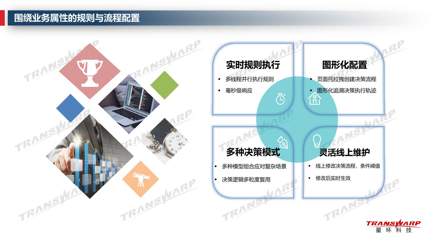 22 .围绕业务属性的规则与流程配置 实时规则执行 图形化配置 ▪ 多线程并行执行规则 ▪ 页面托拉拽创建决策流程 ▪ 毫秒级响应 ▪ 图形化追溯决策执行轨迹 多种决策模式 灵活线上维护 ▪ 多种模型组合应对复杂场景 ▪ 线上修改决策流程,条件阈值 ▪ 决策逻辑多粒度复用 ▪ 修改后实时生效 星 环 科 技