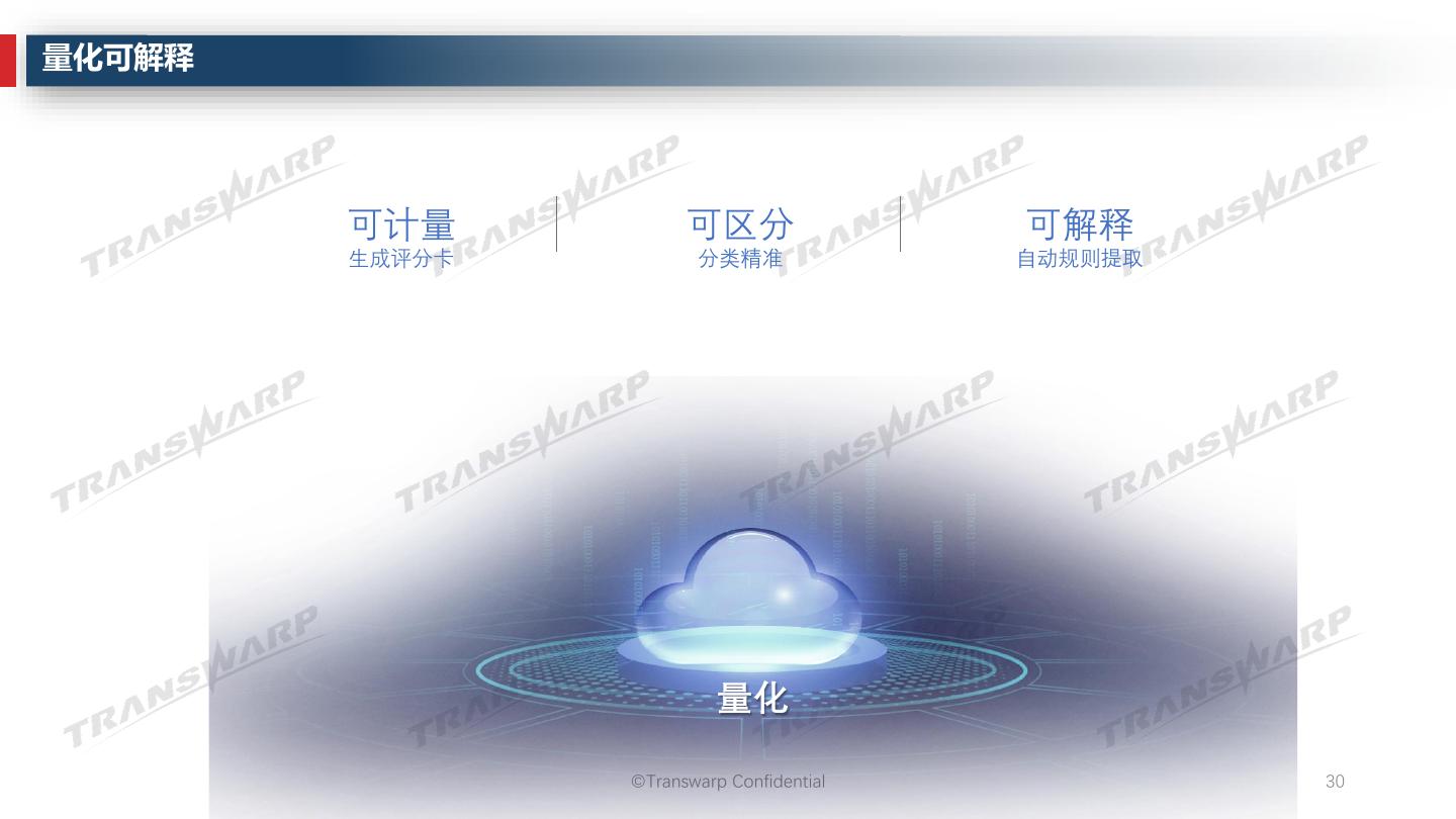 29 .事中可实时 流式计算 秒批秒贷 日审单量 最低延时<20ms 最快3s/笔 峰值可达50万笔 实时 ©Transwarp Confidential 29