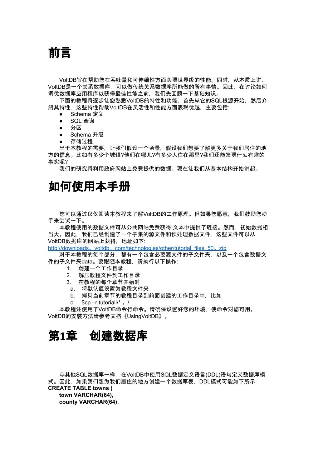 2 .前言 VoltDB旨在帮助您在吞吐量和可伸缩性方面实现世界级的性能。同时,从本质上讲, VoltDB是一个关系数据库,可以做传统关系数据库所能做的所有事情。因此,在讨论如何 调优数据库应用程序以获得最佳性能之前,我们先回顾一下基础知识。 下面的教程将逐步让您熟悉VoltDB的特性和功能,首先从它的SQL根源开始,然后介 绍其特性,这些特性帮助VoltDB在灵活性和性能方面表现优越,主要包括: ● Schema 定义 ● SQL 查询 ● 分区 ● Schema 升级 ● 存储过程 出于本教程的需要,让我们假设一个场景,假设我们想要了解更多关于我们居住的地 方的信息。比如有多少个城镇?他们在哪儿?有多少人住在那里?我们还能发现什么有趣的 事实呢? 我们的研究将利用政府网站上免费提供的数据。现在让我们从基本结构开始讲起。 如何使用本手册 您可以通过仅仅阅读本教程来了解VoltDB的工作原理。但如果您愿意,我们鼓励您动 手来尝试一下。 本教程使用的数据文件可从公共网站免费获得;文本中提供了链接。然而,初始数据相 当大。因此,我们已经创建了一个子集的源文件和预处理数据文件,这些文件可以从 VoltDB数据库的网站上获得,地址如下: http://downloads。voltdb。com/technologies/other/tutorial_files_50。zip 对于本教程的每个部分,都有一个包含必要源文件的子文件夹,以及一个包含数据文 件的子文件夹data。要跟随本教程,请执行以下操作: 1. 创建一个工作目录 2. 解压教程文件到工作目录 3. 在教程的每个章节开始时 a. 将默认值设置为教程文件夹 b. 拷贝当前章节的教程目录到前面创建的工作目录中,比如 c. $cp –r tutoriall/* 。/ 本教程还使用了VoltDB命令行命令。请确保设置好您的环境,使命令对您可用。 VoltDB的安装方法请参考文档《UsingVoltDB》。 第1章 创建数据库 与其他SQL数据库一样,在VoltDB中使用SQL数据定义语言(DDL)语句定义数据库模 式。因此,如果我们想为我们居住的地方创建一个数据库表,DDL模式可能如下所示 CREATE TABLE towns ( town VARCHAR(64), county VARCHAR(64),