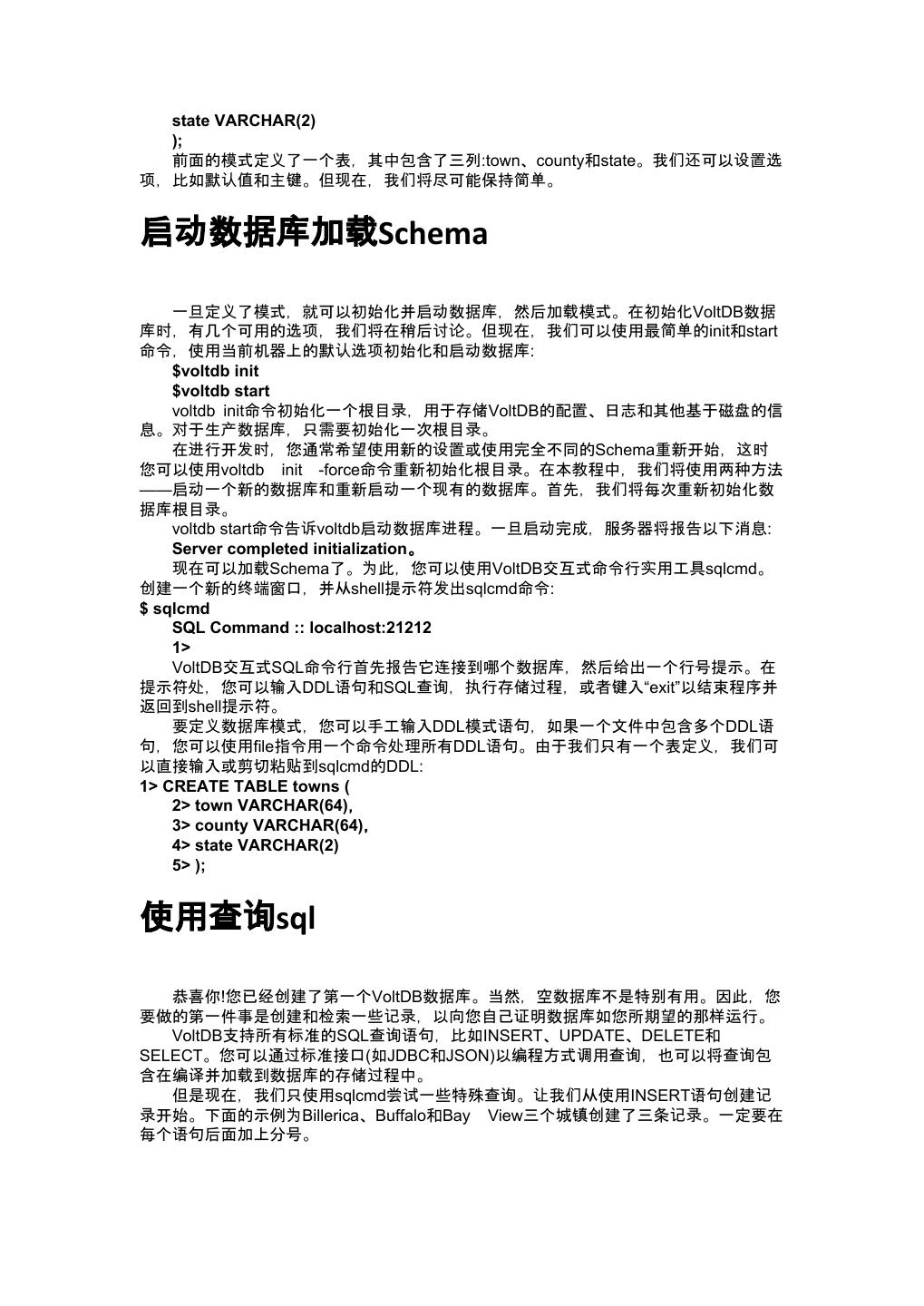 3 . state VARCHAR(2) ); 前面的模式定义了一个表,其中包含了三列:town、county和state。我们还可以设置选 项,比如默认值和主键。但现在,我们将尽可能保持简单。 启动数据库加载Schema 一旦定义了模式,就可以初始化并启动数据库,然后加载模式。在初始化VoltDB数据 库时,有几个可用的选项,我们将在稍后讨论。但现在,我们可以使用最简单的init和start 命令,使用当前机器上的默认选项初始化和启动数据库: $voltdb init $voltdb start voltdb init命令初始化一个根目录,用于存储VoltDB的配置、日志和其他基于磁盘的信 息。对于生产数据库,只需要初始化一次根目录。 在进行开发时,您通常希望使用新的设置或使用完全不同的Schema重新开始,这时 您可以使用voltdb init -force命令重新初始化根目录。在本教程中,我们将使用两种方法 ——启动一个新的数据库和重新启动一个现有的数据库。首先,我们将每次重新初始化数 据库根目录。 voltdb start命令告诉voltdb启动数据库进程。一旦启动完成,服务器将报告以下消息: Server completed initialization。 现在可以加载Schema了。为此,您可以使用VoltDB交互式命令行实用工具sqlcmd。 创建一个新的终端窗口,并从shell提示符发出sqlcmd命令: $ sqlcmd SQL Command :: localhost:21212 1> VoltDB交互式SQL命令行首先报告它连接到哪个数据库,然后给出一个行号提示。在 提示符处,您可以输入DDL语句和SQL查询,执行存储过程,或者键入“exit”以结束程序并 返回到shell提示符。 要定义数据库模式,您可以手工输入DDL模式语句,如果一个文件中包含多个DDL语 句,您可以使用file指令用一个命令处理所有DDL语句。由于我们只有一个表定义,我们可 以直接输入或剪切粘贴到sqlcmd的DDL: 1> CREATE TABLE towns ( 2> town VARCHAR(64), 3> county VARCHAR(64), 4> state VARCHAR(2) 5> ); 使用查询sql 恭喜你!您已经创建了第一个VoltDB数据库。当然,空数据库不是特别有用。因此,您 要做的第一件事是创建和检索一些记录,以向您自己证明数据库如您所期望的那样运行。 VoltDB支持所有标准的SQL查询语句,比如INSERT、UPDATE、DELETE和 SELECT。您可以通过标准接口(如JDBC和JSON)以编程方式调用查询,也可以将查询包 含在编译并加载到数据库的存储过程中。 但是现在,我们只使用sqlcmd尝试一些特殊查询。让我们从使用INSERT语句创建记 录开始。下面的示例为Billerica、Buffalo和Bay View三个城镇创建了三条记录。一定要在 每个语句后面加上分号。