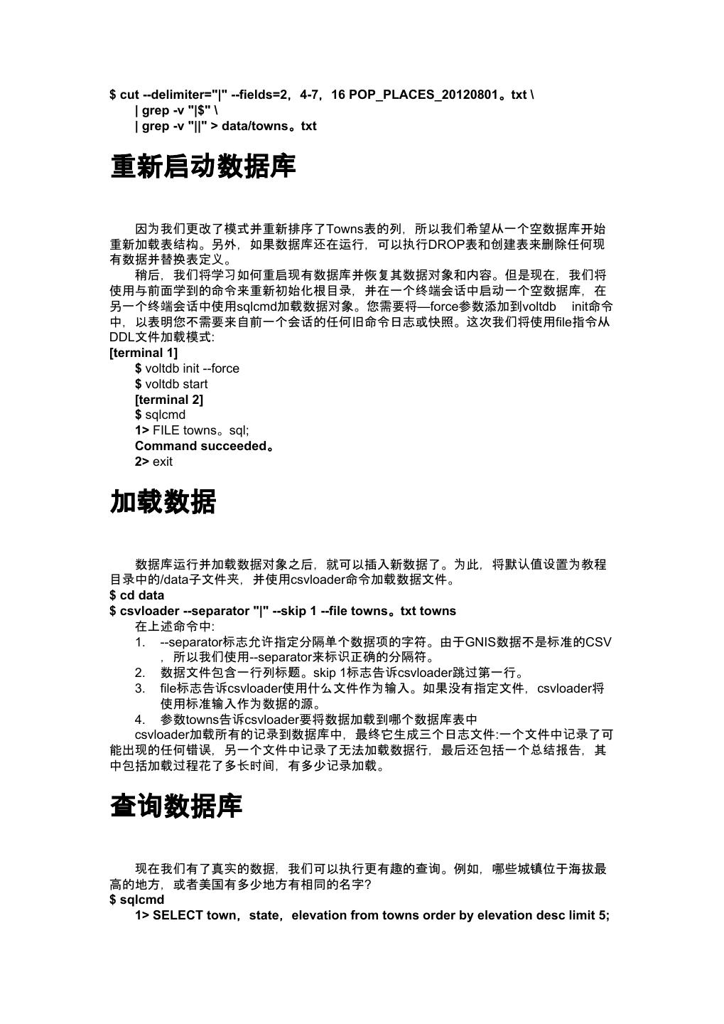 5 .$ cut --delimiter="|" --fields=2,4-7,16 POP_PLACES_20120801。txt \ | grep -v "|$" \ | grep -v "||" > data/towns。txt 重新启动数据库 因为我们更改了模式并重新排序了Towns表的列,所以我们希望从一个空数据库开始 重新加载表结构。另外,如果数据库还在运行,可以执行DROP表和创建表来删除任何现 有数据并替换表定义。 稍后,我们将学习如何重启现有数据库并恢复其数据对象和内容。但是现在,我们将 使用与前面学到的命令来重新初始化根目录,并在一个终端会话中启动一个空数据库,在 另一个终端会话中使用sqlcmd加载数据对象。您需要将—force参数添加到voltdb init命令 中,以表明您不需要来自前一个会话的任何旧命令日志或快照。这次我们将使用file指令从 DDL文件加载模式: [terminal 1] $ voltdb init --force $ voltdb start [terminal 2] $ sqlcmd 1> FILE towns。sql; Command succeeded。 2> exit 加载数据 数据库运行并加载数据对象之后,就可以插入新数据了。为此,将默认值设置为教程 目录中的/data子文件夹,并使用csvloader命令加载数据文件。 $ cd data $ csvloader --separator "|" --skip 1 --file towns。txt towns 在上述命令中: 1. --separator标志允许指定分隔单个数据项的字符。由于GNIS数据不是标准的CSV ,所以我们使用--separator来标识正确的分隔符。 2. 数据文件包含一行列标题。skip 1标志告诉csvloader跳过第一行。 3. file标志告诉csvloader使用什么文件作为输入。如果没有指定文件,csvloader将 使用标准输入作为数据的源。 4. 参数towns告诉csvloader要将数据加载到哪个数据库表中 csvloader加载所有的记录到数据库中,最终它生成三个日志文件:一个文件中记录了可 能出现的任何错误,另一个文件中记录了无法加载数据行,最后还包括一个总结报告,其 中包括加载过程花了多长时间,有多少记录加载。 查询数据库 现在我们有了真实的数据,我们可以执行更有趣的查询。例如,哪些城镇位于海拔最 高的地方,或者美国有多少地方有相同的名字? $ sqlcmd 1> SELECT town,state,elevation from towns order by elevation desc limit 5;