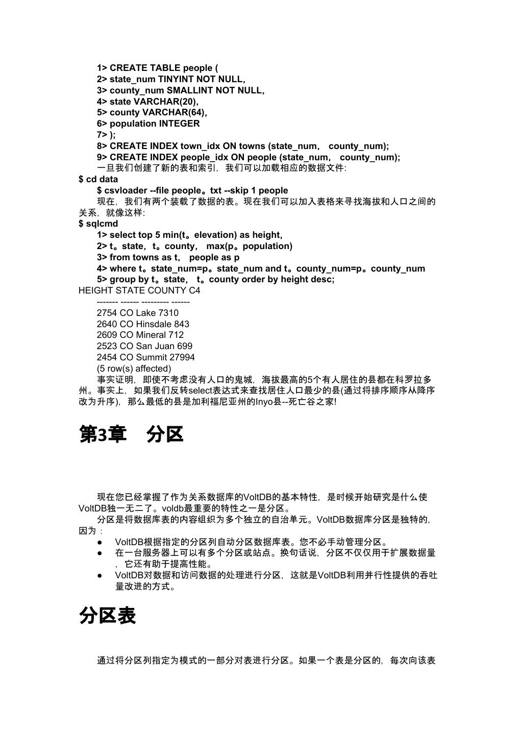 7 . 1> CREATE TABLE people ( 2> state_num TINYINT NOT NULL, 3> county_num SMALLINT NOT NULL, 4> state VARCHAR(20), 5> county VARCHAR(64), 6> population INTEGER 7> ); 8> CREATE INDEX town_idx ON towns (state_num, county_num); 9> CREATE INDEX people_idx ON people (state_num, county_num); 一旦我们创建了新的表和索引,我们可以加载相应的数据文件: $ cd data $ csvloader --file people。txt --skip 1 people 现在,我们有两个装载了数据的表。现在我们可以加入表格来寻找海拔和人口之间的 关系,就像这样: $ sqlcmd 1> select top 5 min(t。elevation) as height, 2> t。state,t。county, max(p。population) 3> from towns as t, people as p 4> where t。state_num=p。state_num and t。county_num=p。county_num 5> group by t。state, t。county order by height desc; HEIGHT STATE COUNTY C4 ------- ------ --------- ------ 2754 CO Lake 7310 2640 CO Hinsdale 843 2609 CO Mineral 712 2523 CO San Juan 699 2454 CO Summit 27994 (5 row(s) affected) 事实证明,即使不考虑没有人口的鬼城,海拔最高的5个有人居住的县都在科罗拉多 州。事实上,如果我们反转select表达式来查找居住人口最少的县(通过将排序顺序从降序 改为升序),那么最低的县是加利福尼亚州的Inyo县--死亡谷之家! 第3章 分区 现在您已经掌握了作为关系数据库的VoltDB的基本特性,是时候开始研究是什么使 VoltDB独一无二了。voldb最重要的特性之一是分区。 分区是将数据库表的内容组织为多个独立的自治单元。VoltDB数据库分区是独特的, 因为: ● VoltDB根据指定的分区列自动分区数据库表。您不必手动管理分区。 ● 在一台服务器上可以有多个分区或站点。换句话说,分区不仅仅用于扩展数据量 ,它还有助于提高性能。 ● VoltDB对数据和访问数据的处理进行分区,这就是VoltDB利用并行性提供的吞吐 量改进的方式。 分区表 通过将分区列指定为模式的一部分对表进行分区。如果一个表是分区的,每次向该表