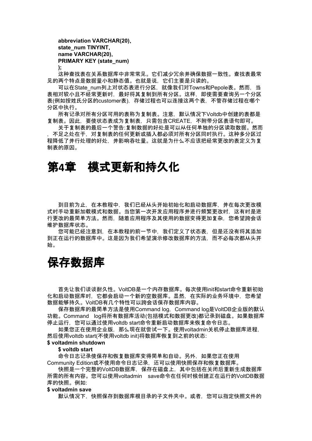 9 . abbreviation VARCHAR(20), state_num TINYINT, name VARCHAR(20), PRIMARY KEY (state_num) ); 这种查找表在关系数据库中非常常见。它们减少冗余并确保数据一致性。查找表最常 见的两个特点是数据量小和静态值。也就是说,它们主要是只读的。 可以在State_num列上对状态表进行分区,就像我们对Towns和Pepole表。然而,当 表相对较小且不经常更新时,最好将其复制到所有分区。这样,即使需要查询另一个分区 表(例如按姓氏分区的customer表),存储过程也可以连接这两个表,不管存储过程在哪个 分区中执行。 所有记录对所有分区可用的表称为复制表。注意,默认情况下Voltdb中创建的表都是 复制表。因此,要使状态表成为复制表,只需包含CREATE,不附带分区表语句即可。 关于复制表的最后一个警告:复制数据的好处是可以从任何单独的分区读取数据。然而 ,不足之处在于,对复制表的任何更新或插入都必须对所有分区同时执行。这种多分区过 程降低了并行处理的好处,并影响吞吐量。这就是为什么不应该把经常更改的表定义为复 制表的原因。 第4章 模式更新和持久化 到目前为止,在本教程中,我们已经从头开始初始化和启动数据库,并在每次更改模 式时手动重新加载模式和数据。当您第一次开发应用程序并进行频繁更改时,这有时是进 行更改的最简单方法。然而,随着应用程序及其使用的数据变得更加复杂,您希望跨会话 维护数据库状态。 您可能已经注意到,在本教程的前一节中,我们定义了状态表,但是还没有将其添加 到正在运行的数据库中。这是因为我们希望演示修改数据库的方法,而不必每次都从头开 始。 保存数据库 首先让我们谈谈耐久性。VoltDB是一个内存数据库。每次使用init和start命令重新初始 化和启动数据库时,它都会启动一个新的空数据库。显然,在实际的业务环境中,您希望 数据能够持久。VoltDB有几个特性可以跨会话保存数据库内容。 保存数据库的最简单方法是使用Command log,Command log是VoltDB企业版的默认 功能。Command log将所有数据库活动(包括模式和数据更改)都记录到磁盘。如果数据库 停止运行,您可以通过使用voltdb start命令重新启动数据库来恢复命令日志。 如果您正在使用企业版,那么现在就尝试一下。使用voltadmin关机停止数据库进程, 然后使用voltdb start(不使用voltdb init)将数据库恢复到之前的状态: $ voltadmin shutdown $ voltdb start 命令日志记录使保存和恢复数据库变得简单和自动。另外,如果您正在使用 Community Edition或不使用命令日志记录,还可以使用快照保存和恢复数据库。 快照是一个完整的VoltDB数据库,保存在磁盘上,其中包括在关闭后重新生成数据库 所需的所有内容。您可以使用voltadmin save命令在任何时候创建正在运行的VoltDB数据 库的快照。例如: $ voltadmin save 默认情况下,快照保存到数据库根目录的子文件夹中。或者,您可以指定快照文件的