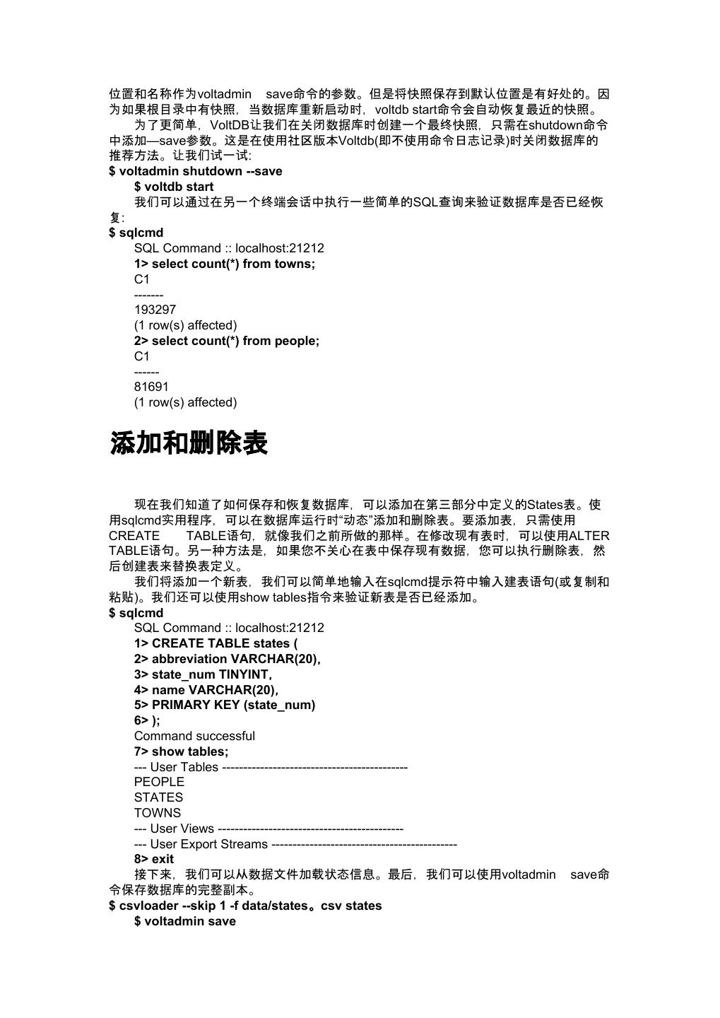 10 .位置和名称作为voltadmin save命令的参数。但是将快照保存到默认位置是有好处的。因 为如果根目录中有快照,当数据库重新启动时,voltdb start命令会自动恢复最近的快照。 为了更简单,VoltDB让我们在关闭数据库时创建一个最终快照,只需在shutdown命令 中添加—save参数。这是在使用社区版本Voltdb(即不使用命令日志记录)时关闭数据库的 推荐方法。让我们试一试: $ voltadmin shutdown --save $ voltdb start 我们可以通过在另一个终端会话中执行一些简单的SQL查询来验证数据库是否已经恢 复: $ sqlcmd SQL Command :: localhost:21212 1> select count(*) from towns; C1 ------- 193297 (1 row(s) affected) 2> select count(*) from people; C1 ------ 81691 (1 row(s) affected) 添加和删除表 现在我们知道了如何保存和恢复数据库,可以添加在第三部分中定义的States表。使 用sqlcmd实用程序,可以在数据库运行时“动态”添加和删除表。要添加表,只需使用 CREATE TABLE语句,就像我们之前所做的那样。在修改现有表时,可以使用ALTER TABLE语句。另一种方法是,如果您不关心在表中保存现有数据,您可以执行删除表,然 后创建表来替换表定义。 我们将添加一个新表,我们可以简单地输入在sqlcmd提示符中输入建表语句(或复制和 粘贴)。我们还可以使用show tables指令来验证新表是否已经添加。 $ sqlcmd SQL Command :: localhost:21212 1> CREATE TABLE states ( 2> abbreviation VARCHAR(20), 3> state_num TINYINT, 4> name VARCHAR(20), 5> PRIMARY KEY (state_num) 6> ); Command successful 7> show tables; --- User Tables -------------------------------------------- PEOPLE STATES TOWNS --- User Views -------------------------------------------- --- User Export Streams -------------------------------------------- 8> exit 接下来,我们可以从数据文件加载状态信息。最后,我们可以使用voltadmin save命 令保存数据库的完整副本。 $ csvloader --skip 1 -f data/states。csv states $ voltadmin save