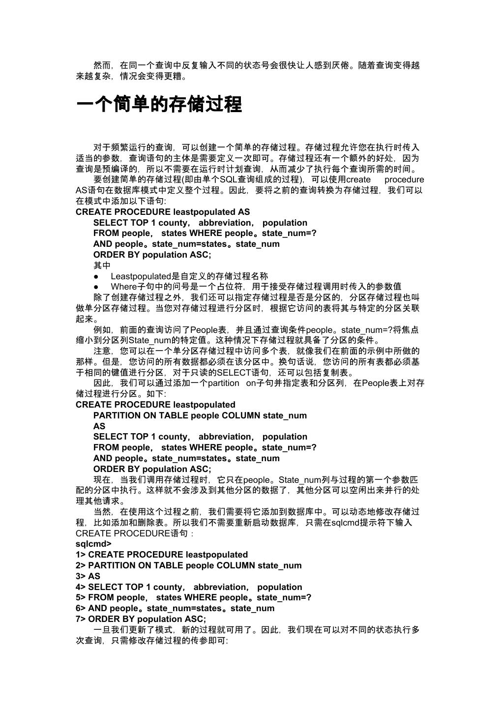 12 . 然而,在同一个查询中反复输入不同的状态号会很快让人感到厌倦。随着查询变得越 来越复杂,情况会变得更糟。 一个简单的存储过程 对于频繁运行的查询,可以创建一个简单的存储过程。存储过程允许您在执行时传入 适当的参数,查询语句的主体是需要定义一次即可。存储过程还有一个额外的好处,因为 查询是预编译的,所以不需要在运行时计划查询,从而减少了执行每个查询所需的时间。 要创建简单的存储过程(即由单个SQL查询组成的过程),可以使用create procedure AS语句在数据库模式中定义整个过程。因此,要将之前的查询转换为存储过程,我们可以 在模式中添加以下语句: CREATE PROCEDURE leastpopulated AS SELECT TOP 1 county, abbreviation, population FROM people, states WHERE people。state_num=? AND people。state_num=states。state_num ORDER BY population ASC; 其中 ● Leastpopulated是自定义的存储过程名称 ● Where子句中的问号是一个占位符,用于接受存储过程调用时传入的参数值 除了创建存储过程之外,我们还可以指定存储过程是否是分区的,分区存储过程也叫 做单分区存储过程。当您对存储过程进行分区时,根据它访问的表将其与特定的分区关联 起来。 例如,前面的查询访问了People表,并且通过查询条件people。state_num=?将焦点 缩小到分区列State_num的特定值。这种情况下存储过程就具备了分区的条件。 注意,您可以在一个单分区存储过程中访问多个表,就像我们在前面的示例中所做的 那样。但是,您访问的所有数据都必须在该分区中。换句话说,您访问的所有表都必须基 于相同的键值进行分区,对于只读的SELECT语句,还可以包括复制表。 因此,我们可以通过添加一个partition on子句并指定表和分区列,在People表上对存 储过程进行分区。如下: CREATE PROCEDURE leastpopulated PARTITION ON TABLE people COLUMN state_num AS SELECT TOP 1 county, abbreviation, population FROM people, states WHERE people。state_num=? AND people。state_num=states。state_num ORDER BY population ASC; 现在,当我们调用存储过程时,它只在people。State_num列与过程的第一个参数匹 配的分区中执行。这样就不会涉及到其他分区的数据了,其他分区可以空闲出来并行的处 理其他请求。 当然,在使用这个过程之前,我们需要将它添加到数据库中。可以动态地修改存储过 程,比如添加和删除表。所以我们不需要重新启动数据库,只需在sqlcmd提示符下输入 CREATE PROCEDURE语句: sqlcmd> 1> CREATE PROCEDURE leastpopulated 2> PARTITION ON TABLE people COLUMN state_num 3> AS 4> SELECT TOP 1 county, abbreviation, population 5> FROM people, states WHERE people。state_num=? 6> AND people。state_num=states。state_num 7> ORDER BY population ASC; 一旦我们更新了模式,新的过程就可用了。因此,我们现在可以对不同的状态执行多 次查询,只需修改存储过程的传参即可: