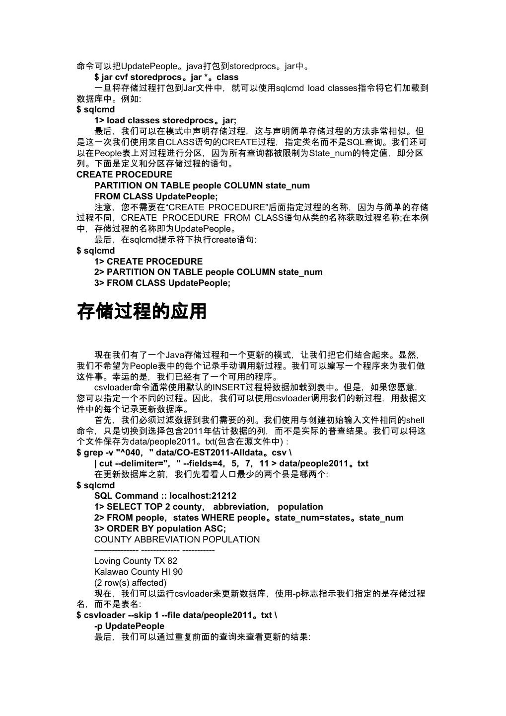 15 .命令可以把UpdatePeople。java打包到storedprocs。jar中。 $ jar cvf storedprocs。jar *。class 一旦将存储过程打包到Jar文件中,就可以使用sqlcmd load classes指令将它们加载到 数据库中。例如: $ sqlcmd 1> load classes storedprocs。jar; 最后,我们可以在模式中声明存储过程,这与声明简单存储过程的方法非常相似。但 是这一次我们使用来自CLASS语句的CREATE过程,指定类名而不是SQL查询。我们还可 以在People表上对过程进行分区,因为所有查询都被限制为State_num的特定值,即分区 列。下面是定义和分区存储过程的语句。 CREATE PROCEDURE PARTITION ON TABLE people COLUMN state_num FROM CLASS UpdatePeople; 注意,您不需要在“CREATE PROCEDURE”后面指定过程的名称,因为与简单的存储 过程不同,CREATE PROCEDURE FROM CLASS语句从类的名称获取过程名称;在本例 中,存储过程的名称即为UpdatePeople。 最后,在sqlcmd提示符下执行create语句: $ sqlcmd 1> CREATE PROCEDURE 2> PARTITION ON TABLE people COLUMN state_num 3> FROM CLASS UpdatePeople; 存储过程的应用 现在我们有了一个Java存储过程和一个更新的模式,让我们把它们结合起来。显然, 我们不希望为People表中的每个记录手动调用新过程。我们可以编写一个程序来为我们做 这件事。幸运的是,我们已经有了一个可用的程序。 csvloader命令通常使用默认的INSERT过程将数据加载到表中。但是,如果您愿意, 您可以指定一个不同的过程。因此,我们可以使用csvloader调用我们的新过程,用数据文 件中的每个记录更新数据库。 首先,我们必须过滤数据到我们需要的列。我们使用与创建初始输入文件相同的shell 命令,只是切换到选择包含2011年估计数据的列,而不是实际的普查结果。我们可以将这 个文件保存为data/people2011。txt(包含在源文件中): $ grep -v "^040," data/CO-EST2011-Alldata。csv \ | cut --delimiter="," --fields=4,5,7,11 > data/people2011。txt 在更新数据库之前,我们先看看人口最少的两个县是哪两个: $ sqlcmd SQL Command :: localhost:21212 1> SELECT TOP 2 county, abbreviation, population 2> FROM people,states WHERE people。state_num=states。state_num 3> ORDER BY population ASC; COUNTY ABBREVIATION POPULATION --------------- ------------- ----------- Loving County TX 82 Kalawao County HI 90 (2 row(s) affected) 现在,我们可以运行csvloader来更新数据库,使用-p标志指示我们指定的是存储过程 名,而不是表名: $ csvloader --skip 1 --file data/people2011。txt \ -p UpdatePeople 最后,我们可以通过重复前面的查询来查看更新的结果: