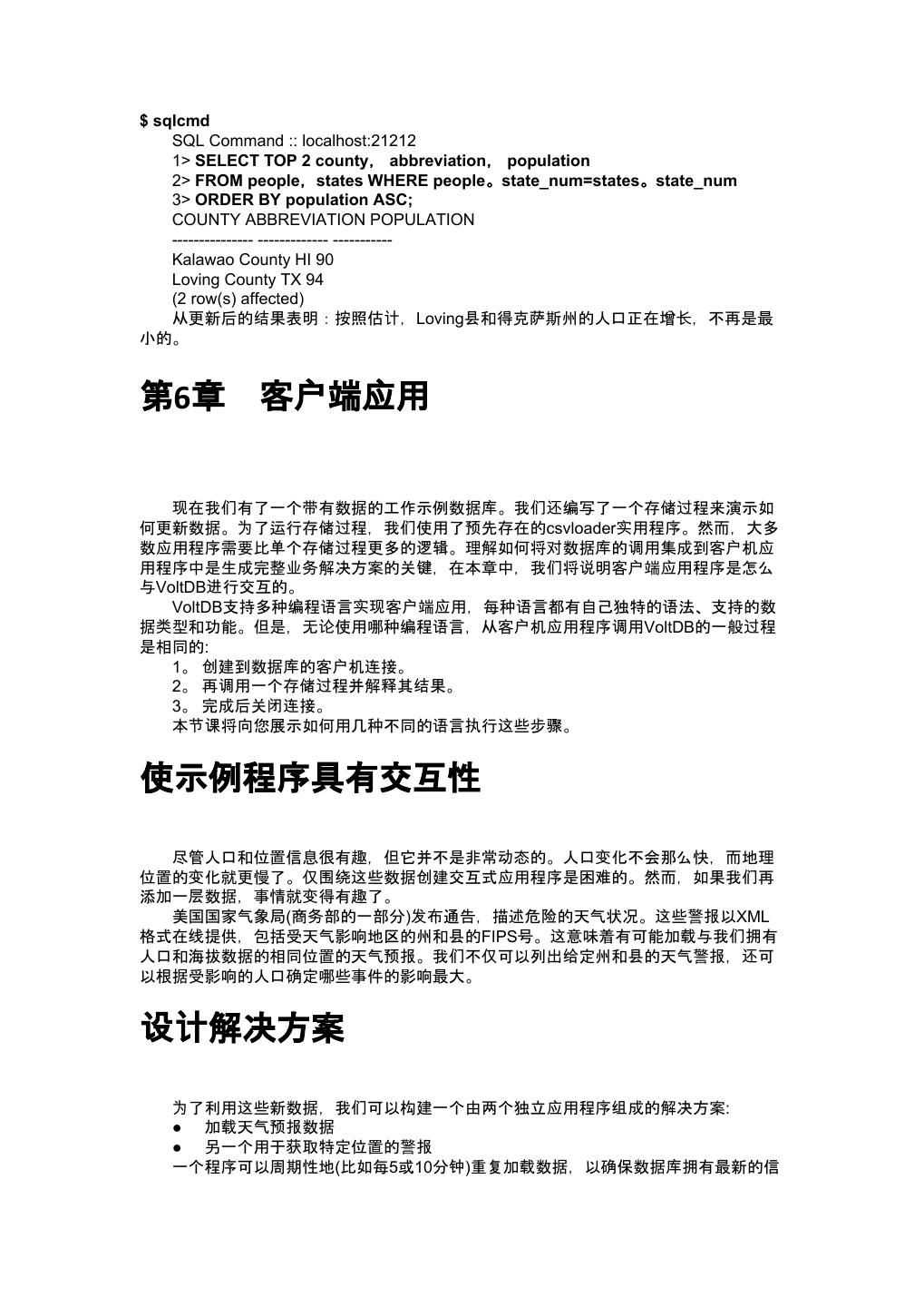 16 .$ sqlcmd SQL Command :: localhost:21212 1> SELECT TOP 2 county, abbreviation, population 2> FROM people,states WHERE people。state_num=states。state_num 3> ORDER BY population ASC; COUNTY ABBREVIATION POPULATION --------------- ------------- ----------- Kalawao County HI 90 Loving County TX 94 (2 row(s) affected) 从更新后的结果表明:按照估计,Loving县和得克萨斯州的人口正在增长,不再是最 小的。 第6章 客户端应用 现在我们有了一个带有数据的工作示例数据库。我们还编写了一个存储过程来演示如 何更新数据。为了运行存储过程,我们使用了预先存在的csvloader实用程序。然而,大多 数应用程序需要比单个存储过程更多的逻辑。理解如何将对数据库的调用集成到客户机应 用程序中是生成完整业务解决方案的关键,在本章中,我们将说明客户端应用程序是怎么 与VoltDB进行交互的。 VoltDB支持多种编程语言实现客户端应用,每种语言都有自己独特的语法、支持的数 据类型和功能。但是,无论使用哪种编程语言,从客户机应用程序调用VoltDB的一般过程 是相同的: 1。 创建到数据库的客户机连接。 2。 再调用一个存储过程并解释其结果。 3。 完成后关闭连接。 本节课将向您展示如何用几种不同的语言执行这些步骤。 使示例程序具有交互性 尽管人口和位置信息很有趣,但它并不是非常动态的。人口变化不会那么快,而地理 位置的变化就更慢了。仅围绕这些数据创建交互式应用程序是困难的。然而,如果我们再 添加一层数据,事情就变得有趣了。 美国国家气象局(商务部的一部分)发布通告,描述危险的天气状况。这些警报以XML 格式在线提供,包括受天气影响地区的州和县的FIPS号。这意味着有可能加载与我们拥有 人口和海拔数据的相同位置的天气预报。我们不仅可以列出给定州和县的天气警报,还可 以根据受影响的人口确定哪些事件的影响最大。 设计解决方案 为了利用这些新数据,我们可以构建一个由两个独立应用程序组成的解决方案: ● 加载天气预报数据 ● 另一个用于获取特定位置的警报 一个程序可以周期性地(比如每5或10分钟)重复加载数据,以确保数据库拥有最新的信