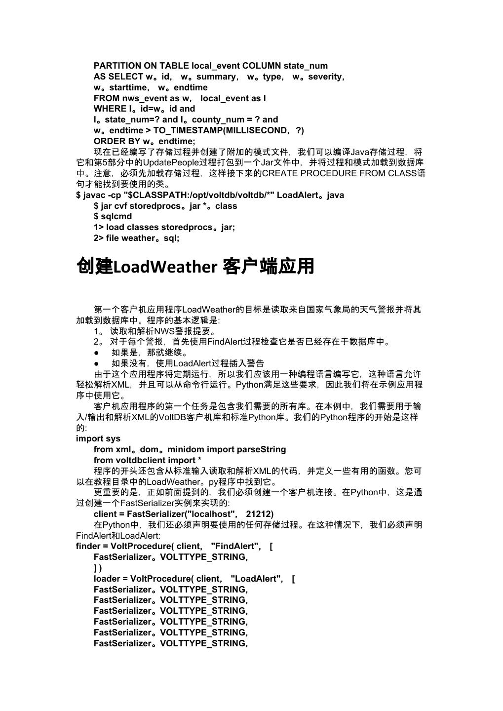 18 . PARTITION ON TABLE local_event COLUMN state_num AS SELECT w。id, w。summary, w。type, w。severity, w。starttime, w。endtime FROM nws_event as w, local_event as l WHERE l。id=w。id and l。state_num=? and l。county_num = ? and w。endtime > TO_TIMESTAMP(MILLISECOND,?) ORDER BY w。endtime; 现在已经编写了存储过程并创建了附加的模式文件,我们可以编译Java存储过程,将 它和第5部分中的UpdatePeople过程打包到一个Jar文件中,并将过程和模式加载到数据库 中。注意,必须先加载存储过程,这样接下来的CREATE PROCEDURE FROM CLASS语 句才能找到要使用的类。 $ javac -cp "$CLASSPATH:/opt/voltdb/voltdb/*" LoadAlert。java $ jar cvf storedprocs。jar *。class $ sqlcmd 1> load classes storedprocs。jar; 2> file weather。sql; 创建LoadWeather 客户端应用 第一个客户机应用程序LoadWeather的目标是读取来自国家气象局的天气警报并将其 加载到数据库中。程序的基本逻辑是: 1。 读取和解析NWS警报提要。 2。 对于每个警报,首先使用FindAlert过程检查它是否已经存在于数据库中。 ● 如果是,那就继续。 ● 如果没有,使用LoadAlert过程插入警告 由于这个应用程序将定期运行,所以我们应该用一种编程语言编写它,这种语言允许 轻松解析XML,并且可以从命令行运行。Python满足这些要求,因此我们将在示例应用程 序中使用它。 客户机应用程序的第一个任务是包含我们需要的所有库。在本例中,我们需要用于输 入/输出和解析XML的VoltDB客户机库和标准Python库。我们的Python程序的开始是这样 的: import sys from xml。dom。minidom import parseString from voltdbclient import * 程序的开头还包含从标准输入读取和解析XML的代码,并定义一些有用的函数。您可 以在教程目录中的LoadWeather。py程序中找到它。 更重要的是,正如前面提到的,我们必须创建一个客户机连接。在Python中,这是通 过创建一个FastSerializer实例来实现的: client = FastSerializer("localhost", 21212) 在Python中,我们还必须声明要使用的任何存储过程。在这种情况下,我们必须声明 FindAlert和LoadAlert: finder = VoltProcedure( client, "FindAlert", [ FastSerializer。VOLTTYPE_STRING, ]) loader = VoltProcedure( client, "LoadAlert", [ FastSerializer。VOLTTYPE_STRING, FastSerializer。VOLTTYPE_STRING, FastSerializer。VOLTTYPE_STRING, FastSerializer。VOLTTYPE_STRING, FastSerializer。VOLTTYPE_STRING, FastSerializer。VOLTTYPE_STRING,
