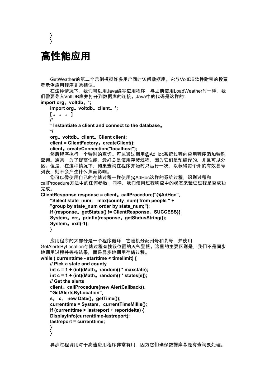 21 . } } 高性能应用 GetWeather的第二个示例模拟许多用户同时访问数据库。它与VoltDB软件附带的投票 者示例应用程序非常相似。 在这种情况下,我们可以用Java编写应用程序,与之前使用LoadWeather时一样,我 们需要导入VoltDB库并打开到数据库的连接。Java中的代码是这样的: import org。voltdb。*; import org。voltdb。client。*; [。。。] /* * Instantiate a client and connect to the database。 */ org。voltdb。client。Client client; client = ClientFactory。createClient(); client。createConnection("localhost"); 然后程序执行一个特别的查询。可以通过调用@AdHoc系统过程向应用程序添加特殊 查询。通常,为了提高性能,最好总是使用存储过程,因为它们是预编译的,并且可以分 区。但是,在这种情况下,如果查询在程序开始时只运行一次,以获得每个州的有效县号 列表,则不会产生什么负面影响。 您可以像使用自己的存储过程一样使用@AdHoc这样的系统过程,识别过程和 callProcedure方法中的任何参数。同样,我们使用过程响应中的状态来验证过程是否成功 完成。 ClientResponse response = client。callProcedure("@AdHoc", "Select state_num, max(county_num) from people " + "group by state_num order by state_num;"); if (response。getStatus() != ClientResponse。SUCCESS){ System。err。println(response。getStatusString()); System。exit(-1); } 应用程序的大部分是一个程序循环,它随机分配州号和县号,并使用 GetAlertsByLocation存储过程查找该位置的天气警报。这里的主要区别是,我们不是同步 地调用过程并等待结果,而是异步地调用存储过程。 while ( currenttime - starttime < timelimit) { // Pick a state and county int s = 1 + (int)(Math。random() * maxstate); int c = 1 + (int)(Math。random() * states[s]); // Get the alerts client。callProcedure(new AlertCallback(), "GetAlertsByLocation", s, c, new Date()。getTime()); currenttime = System。currentTimeMillis(); if (currenttime > lastreport + reportdelta) { DisplayInfo(currenttime-lastreport); lastreport = currenttime; } } 异步过程调用对于高速应用程序非常有用,因为它们确保数据库总是有查询要处理。