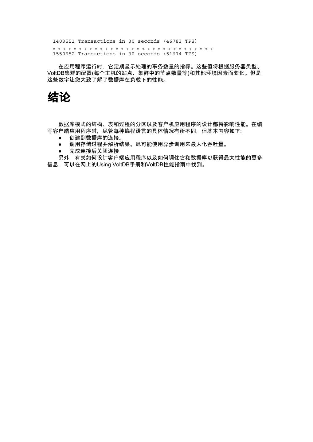 23 . 1403551 Transactions in 30 seconds (46783 TPS) 。。。。。。。。。。。。。。。。。。。。。。。。。。。。。。。 1550652 Transactions in 30 seconds (51674 TPS) 在应用程序运行时,它定期显示处理的事务数量的指标。这些值将根据服务器类型、 VoltDB集群的配置(每个主机的站点、集群中的节点数量等)和其他环境因素而变化。但是 这些数字让您大致了解了数据库在负载下的性能。 结论 数据库模式的结构、表和过程的分区以及客户机应用程序的设计都将影响性能。在编 写客户端应用程序时,尽管每种编程语言的具体情况有所不同,但基本内容如下: ● 创建到数据库的连接。 ● 调用存储过程并解析结果。尽可能使用异步调用来最大化吞吐量。 ● 完成连接后关闭连接 另外,有关如何设计客户端应用程序以及如何调优它和数据库以获得最大性能的更多 信息,可以在网上的Using VoltDB手册和VoltDB性能指南中找到。