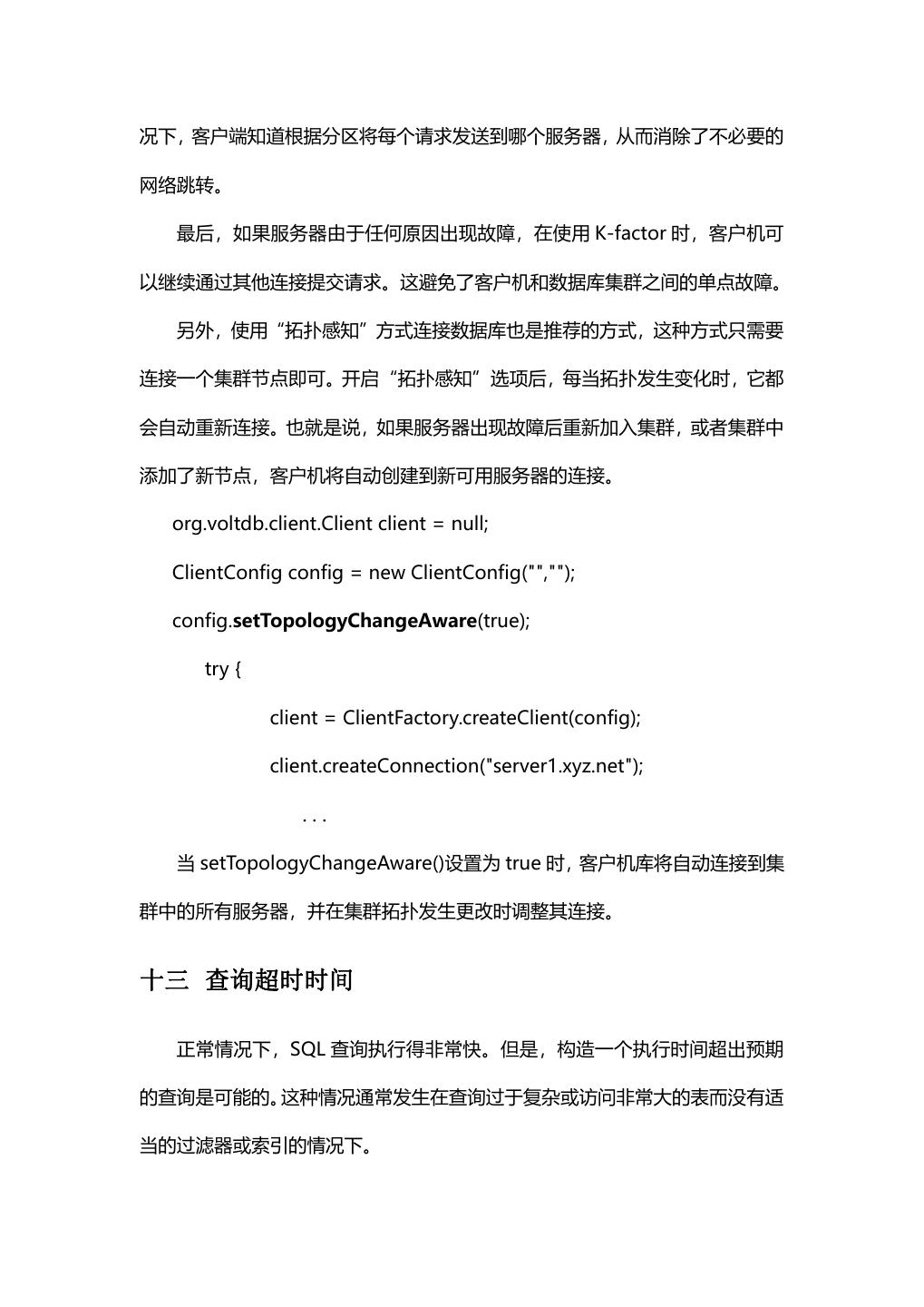 14 .况下,客户端知道根据分区将每个请求发送到哪个服务器,从而消除了不必要的 网络跳转。 最后,如果服务器由于任何原因出现故障,在使用 K-factor 时,客户机可 以继续通过其他连接提交请求。这避免了客户机和数据库集群之间的单点故障。 另外,使用“拓扑感知”方式连接数据库也是推荐的方式,这种方式只需要 连接一个集群节点即可。开启“拓扑感知”选项后,每当拓扑发生变化时,它都 会自动重新连接。也就是说,如果服务器出现故障后重新加入集群,或者集群中 添加了新节点,客户机将自动创建到新可用服务器的连接。 org.voltdb.client.Client client = null; ClientConfig config = new ClientConfig("",""); config.setTopologyChangeAware(true); try { client = ClientFactory.createClient(config); client.createConnection("server1.xyz.net"); ... 当 setTopologyChangeAware()设置为 true 时,客户机库将自动连接到集 群中的所有服务器,并在集群拓扑发生更改时调整其连接。 十三 查询超时时间 正常情况下,SQL 查询执行得非常快。但是,构造一个执行时间超出预期 的查询是可能的。这种情况通常发生在查询过于复杂或访问非常大的表而没有适 当的过滤器或索引的情况下。