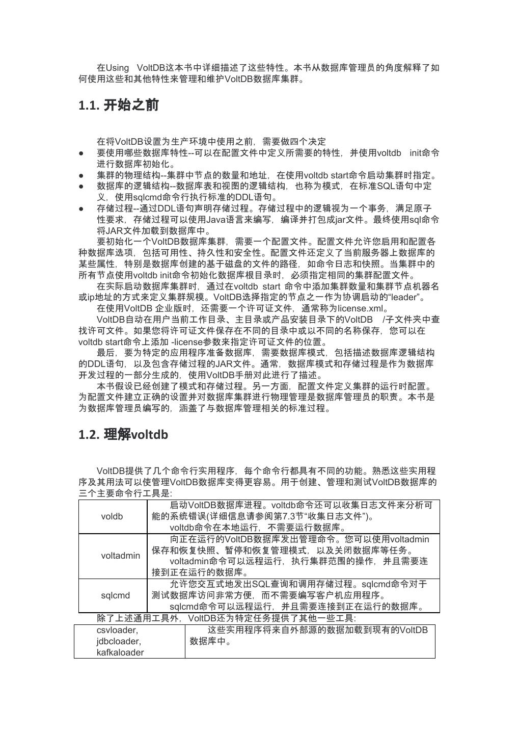 4 . 在Using VoltDB这本书中详细描述了这些特性。本书从数据库管理员的角度解释了如 何使用这些和其他特性来管理和维护VoltDB数据库集群。 1.1. 开始之前 在将VoltDB设置为生产环境中使用之前,需要做四个决定 ● 要使用哪些数据库特性--可以在配置文件中定义所需要的特性,并使用voltdb init命令 进行数据库初始化。 ● 集群的物理结构--集群中节点的数量和地址,在使用voltdb start命令启动集群时指定。 ● 数据库的逻辑结构--数据库表和视图的逻辑结构,也称为模式,在标准SQL语句中定 义,使用sqlcmd命令行执行标准的DDL语句。 ● 存储过程--通过DDL语句声明存储过程。存储过程中的逻辑视为一个事务,满足原子 性要求,存储过程可以使用Java语言来编写,编译并打包成jar文件。最终使用sql命令 将JAR文件加载到数据库中。 要初始化一个VoltDB数据库集群,需要一个配置文件。配置文件允许您启用和配置各 种数据库选项,包括可用性、持久性和安全性。配置文件还定义了当前服务器上数据库的 某些属性,特别是数据库创建的基于磁盘的文件的路径,如命令日志和快照。当集群中的 所有节点使用voltdb init命令初始化数据库根目录时,必须指定相同的集群配置文件。 在实际启动数据库集群时,通过在voltdb start 命令中添加集群数量和集群节点机器名 或ip地址的方式来定义集群规模。VoltDB选择指定的节点之一作为协调启动的“leader”。 在使用VoltDB 企业版时,还需要一个许可证文件,通常称为license.xml。 VoltDB自动在用户当前工作目录、主目录或产品安装目录下的VoltDB /子文件夹中查 找许可文件。如果您将许可证文件保存在不同的目录中或以不同的名称保存,您可以在 voltdb start命令上添加 -license参数来指定许可证文件的位置。 最后,要为特定的应用程序准备数据库,需要数据库模式,包括描述数据库逻辑结构 的DDL语句,以及包含存储过程的JAR文件。通常,数据库模式和存储过程是作为数据库 开发过程的一部分生成的,使用VoltDB手册对此进行了描述。 本书假设已经创建了模式和存储过程。另一方面,配置文件定义集群的运行时配置。 为配置文件建立正确的设置并对数据库集群进行物理管理是数据库管理员的职责。本书是 为数据库管理员编写的,涵盖了与数据库管理相关的标准过程。 1.2. 理解voltdb VoltDB提供了几个命令行实用程序,每个命令行都具有不同的功能。熟悉这些实用程 序及其用法可以使管理VoltDB数据库变得更容易。用于创建、管理和测试VoltDB数据库的 三个主要命令行工具是: 启动VoltDB数据库进程。voltdb命令还可以收集日志文件来分析可 voldb 能的系统错误(详细信息请参阅第7.3节“收集日志文件”)。 voltdb命令在本地运行,不需要运行数据库。 向正在运行的VoltDB数据库发出管理命令。您可以使用voltadmin 保存和恢复快照、暂停和恢复管理模式,以及关闭数据库等任务。 voltadmin voltadmin命令可以远程运行,执行集群范围的操作,并且需要连 接到正在运行的数据库。 允许您交互式地发出SQL查询和调用存储过程。sqlcmd命令对于 sqlcmd 测试数据库访问非常方便,而不需要编写客户机应用程序。 sqlcmd命令可以远程运行,并且需要连接到正在运行的数据库。 除了上述通用工具外,VoltDB还为特定任务提供了其他一些工具: csvloader, 这些实用程序将来自外部源的数据加载到现有的VoltDB jdbcloader, 数据库中。 kafkaloader