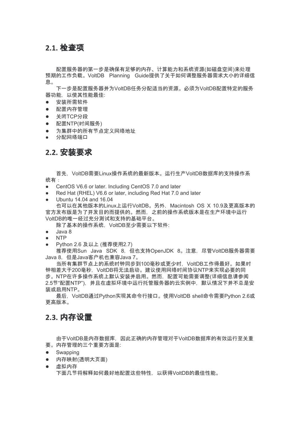 6 .2.1. 检查项 配置服务器的第一步是确保有足够的内存、计算能力和系统资源(如磁盘空间)来处理 预期的工作负载。VoltDB Planning Guide提供了关于如何调整服务器需求大小的详细信 息。 下一步是配置服务器并为VoltDB任务分配适当的资源。必须为VoltDB配置特定的服务 器功能,以使其性能最佳: ● 安装所需软件 ● 配置内存管理 ● 关闭TCP分段 ● 配置NTP(时间服务) ● 为集群中的所有节点定义网络地址 ● 分配网络端口 2.2. 安装要求 首先,VoltDB需要Linux操作系统的最新版本。运行生产VoltDB数据库的支持操作系 统有: ● CentOS V6.6 or later. Including CentOS 7.0 and later ● Red Hat (RHEL) V6.6 or later, including Red Hat 7.0 and later ● Ubuntu 14.04 and 16.04 也可以在其他版本的Linux上运行VoltDB。另外,Macintosh OS X 10.9及更高版本的 官方发布版是为了开发目的而提供的。然而,之前的操作系统版本是在生产环境中运行 VoltDB的唯一经过充分测试和支持的基础平台。 除了基本的操作系统,VoltDB至少需要以下软件: ● Java 8 ● NTP ● Python 2.6 及以上 (推荐使用2.7) 推荐使用Sun Java SDK 8,但也支持OpenJDK 8。注意,尽管VoltDB服务器需要 Java 8,但是Java客户机也兼容Java 7。 当所有集群节点上的系统时钟同步到100毫秒或更少时,VoltDB工作得最好。如果时 钟相差大于200毫秒,VoltDB将无法启动。建议使用网络时间协议NTP来实现必要的同 步。NTP在许多操作系统上默认安装并启用。然而,配置可能需要调整(详细信息请参阅 2.5节“配置NTP”),并且在虚拟环境中运行托管服务器的云实例中,默认情况下并不总是安 装或启用NTP。 最后,VoltDB通过Python实现其命令行接口。使用VoltDB shell命令需要Python 2.6或 更高版本。 2.3. 内存设置 由于VoltDB是内存数据库,因此正确的内存管理对于VoltDB数据库的有效运行至关重 要。内存管理的三个重要方面是: ● Swapping ● 内存映射(透明大页面) ● 虚拟内存 下面几节将解释如何最好地配置这些特性,以获得VoltDB的最佳性能。