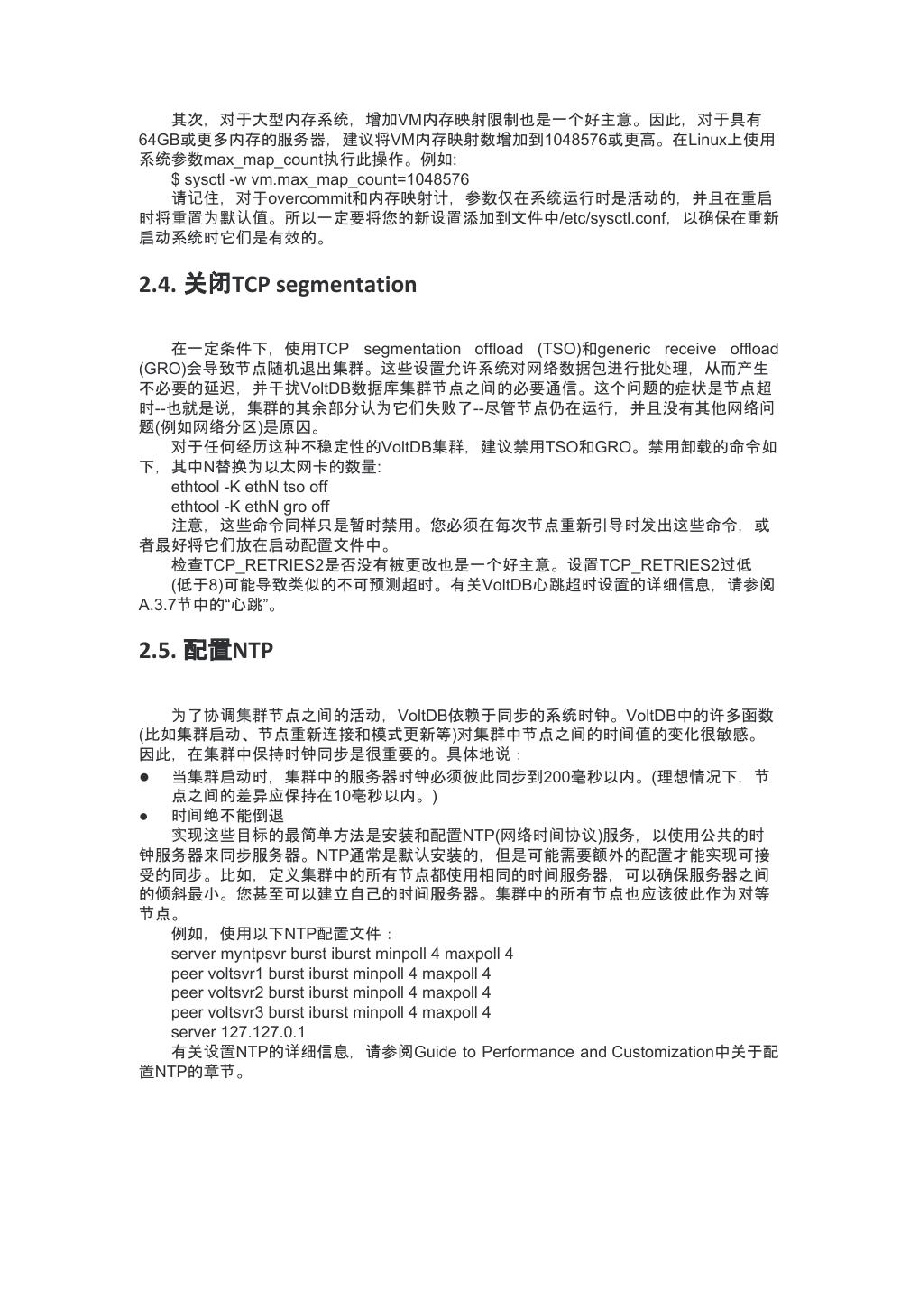 8 . 其次,对于大型内存系统,增加VM内存映射限制也是一个好主意。因此,对于具有 64GB或更多内存的服务器,建议将VM内存映射数增加到1048576或更高。在Linux上使用 系统参数max_map_count执行此操作。例如: $ sysctl -w vm.max_map_count=1048576 请记住,对于overcommit和内存映射计,参数仅在系统运行时是活动的,并且在重启 时将重置为默认值。所以一定要将您的新设置添加到文件中/etc/sysctl.conf,以确保在重新 启动系统时它们是有效的。 2.4. 关闭TCP segmentation 在一定条件下,使用TCP segmentation offload (TSO)和generic receive offload (GRO)会导致节点随机退出集群。这些设置允许系统对网络数据包进行批处理,从而产生 不必要的延迟,并干扰VoltDB数据库集群节点之间的必要通信。这个问题的症状是节点超 时--也就是说,集群的其余部分认为它们失败了--尽管节点仍在运行,并且没有其他网络问 题(例如网络分区)是原因。 对于任何经历这种不稳定性的VoltDB集群,建议禁用TSO和GRO。禁用卸载的命令如 下,其中N替换为以太网卡的数量: ethtool -K ethN tso off ethtool -K ethN gro off 注意,这些命令同样只是暂时禁用。您必须在每次节点重新引导时发出这些命令,或 者最好将它们放在启动配置文件中。 检查TCP_RETRIES2是否没有被更改也是一个好主意。设置TCP_RETRIES2过低 (低于8)可能导致类似的不可预测超时。有关VoltDB心跳超时设置的详细信息,请参阅 A.3.7节中的“心跳”。 2.5. 配置NTP 为了协调集群节点之间的活动,VoltDB依赖于同步的系统时钟。VoltDB中的许多函数 (比如集群启动、节点重新连接和模式更新等)对集群中节点之间的时间值的变化很敏感。 因此,在集群中保持时钟同步是很重要的。具体地说: ● 当集群启动时,集群中的服务器时钟必须彼此同步到200毫秒以内。(理想情况下,节 点之间的差异应保持在10毫秒以内。) ● 时间绝不能倒退 实现这些目标的最简单方法是安装和配置NTP(网络时间协议)服务,以使用公共的时 钟服务器来同步服务器。NTP通常是默认安装的,但是可能需要额外的配置才能实现可接 受的同步。比如,定义集群中的所有节点都使用相同的时间服务器,可以确保服务器之间 的倾斜最小。您甚至可以建立自己的时间服务器。集群中的所有节点也应该彼此作为对等 节点。 例如,使用以下NTP配置文件: server myntpsvr burst iburst minpoll 4 maxpoll 4 peer voltsvr1 burst iburst minpoll 4 maxpoll 4 peer voltsvr2 burst iburst minpoll 4 maxpoll 4 peer voltsvr3 burst iburst minpoll 4 maxpoll 4 server 127.127.0.1 有关设置NTP的详细信息,请参阅Guide to Performance and Customization中关于配 置NTP的章节。