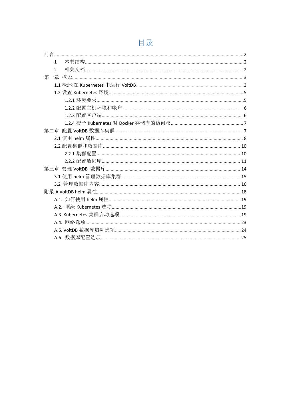 2 . 目录 前言.....................................................................................................................................................2 1 本书结构.............................................................................................................................2 2 相关文档.............................................................................................................................2 第一章 概念.......................................................................................................................................3 1.1 概述:在 Kubernetes 中运行 VoltDB.....................................................................................3 1.2 设置 Kubernetes 环境.......................................................................................................... 5 1.2.1 环境要求....................................................................................................................5 1.2.2 配置主机环境和帐户............................................................................................... 6 1.2.3 配置客户端............................................................................................................... 6 1.2.4 授予 Kubernetes 对 Docker 存储库的访问权......................................................... 7 第二章 配置 VoltDB 数据库集群..................................................................................................... 7 2.1 使用 helm 属性.................................................................................................................... 8 2.2 配置集群和数据库............................................................................................................ 10 2.2.1 集群配置................................................................................................................. 10 2.2.2 配置数据库............................................................................................................. 11 第三章 管理 VoltDB 数据库.......................................................................................................... 14 3.1 使用 helm 管理数据库集群.............................................................................................. 15 3.2 管理数据库内容............................................................................................................... 16 附录 A VoltDB helm 属性................................................................................................................. 18 A.1. 如何使用 helm 属性........................................................................................................19 A.2. 顶级 Kubernetes 选项......................................................................................................19 A.3. Kubernetes 集群启动选项................................................................................................19 A.4. 网络选项.......................................................................................................................... 23 A.5. VoltDB 数据库启动选项................................................................................................... 24 A.6. 数据库配置选项.............................................................................................................. 25