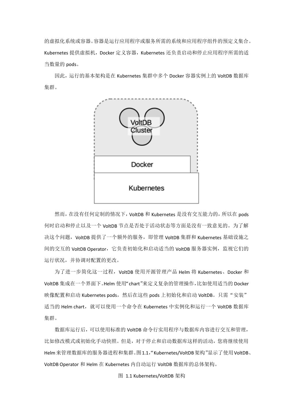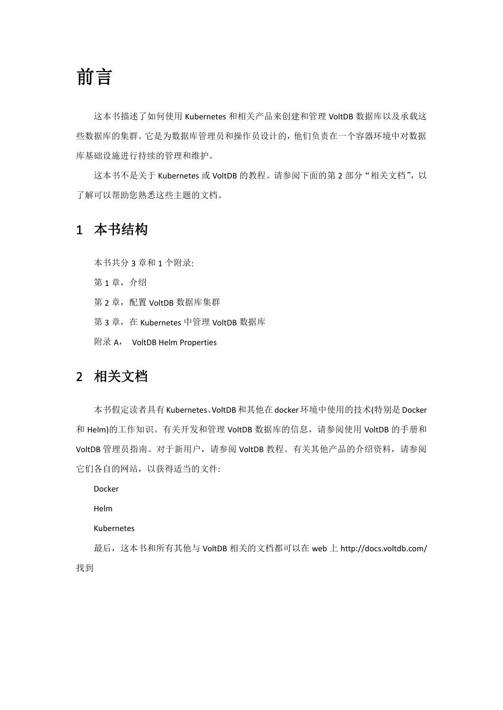3 .前言 这本书描述了如何使用 Kubernetes 和相关产品来创建和管理 VoltDB 数据库以及承载这 些数据库的集群。它是为数据库管理员和操作员设计的,他们负责在一个容器环境中对数据 库基础设施进行持续的管理和维护。 这本书不是关于 Kubernetes 或 VoltDB 的教程。请参阅下面的第 2 部分“相关文档” ,以 了解可以帮助您熟悉这些主题的文档。 1 本书结构 本书共分 3 章和 1 个附录: 第 1 章,介绍 第 2 章,配置 VoltDB 数据库集群 第 3 章,在 Kubernetes 中管理 VoltDB 数据库 附录 A, VoltDB Helm Properties 2 相关文档 本书假定读者具有 Kubernetes、VoltDB 和其他在 docker 环境中使用的技术(特别是 Docker 和 Helm)的工作知识。有关开发和管理 VoltDB 数据库的信息,请参阅使用 VoltDB 的手册和 VoltDB 管理员指南。对于新用户,请参阅 VoltDB 教程。有关其他产品的介绍资料,请参阅 它们各自的网站,以获得适当的文件: Docker Helm Kubernetes 最后,这本书和所有其他与 VoltDB 相关的文档都可以在 web 上 http://docs.voltdb.com/ 找到
