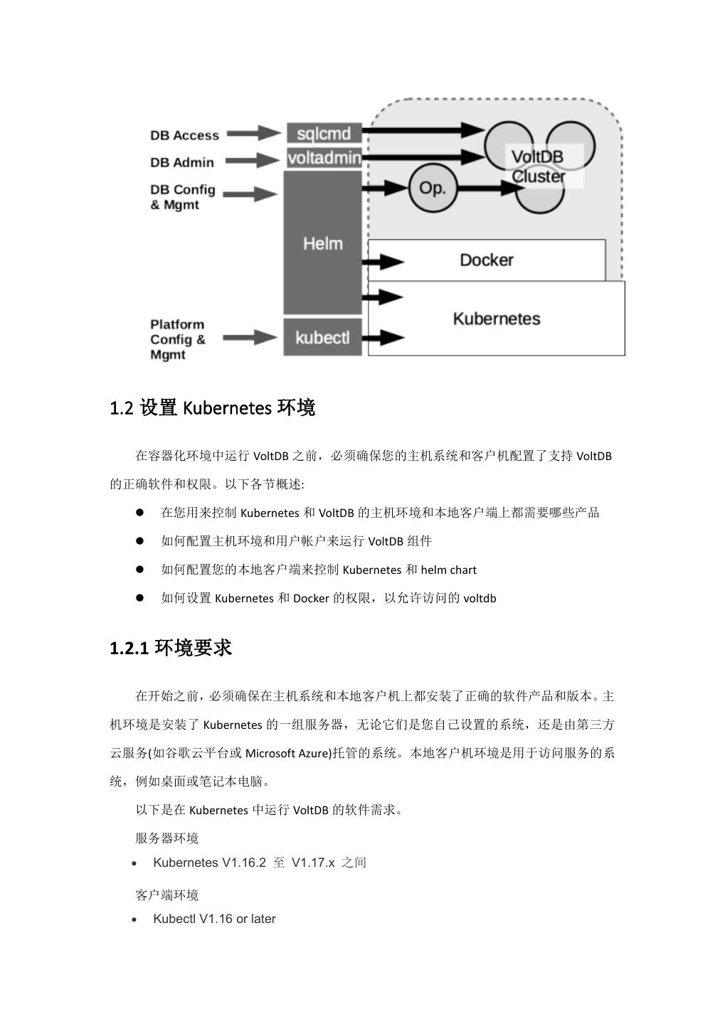 6 .1.2 设置 Kubernetes 环境 在容器化环境中运行 VoltDB 之前,必须确保您的主机系统和客户机配置了支持 VoltDB 的正确软件和权限。以下各节概述: 在您用来控制 Kubernetes 和 VoltDB 的主机环境和本地客户端上都需要哪些产品 如何配置主机环境和用户帐户来运行 VoltDB 组件 如何配置您的本地客户端来控制 Kubernetes 和 helm chart 如何设置 Kubernetes 和 Docker 的权限,以允许访问的 voltdb 1.2.1 环境要求 在开始之前,必须确保在主机系统和本地客户机上都安装了正确的软件产品和版本。主 机环境是安装了 Kubernetes 的一组服务器,无论它们是您自己设置的系统,还是由第三方 云服务(如谷歌云平台或 Microsoft Azure)托管的系统。本地客户机环境是用于访问服务的系 统,例如桌面或笔记本电脑。 以下是在 Kubernetes 中运行 VoltDB 的软件需求。 服务器环境 Kubernetes V1.16.2 至 V1.17.x 之间 客户端环境 Kubectl V1.16 or later