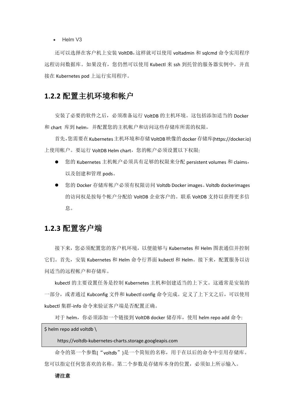 7 . Helm V3 还可以选择在客户机上安装 VoltDB,这样就可以使用 voltadmin 和 sqlcmd 命令实用程序 远程访问数据库。如果没有,您仍然可以使用 Kubectl 来 ssh 到托管的服务器实例中,并直 接在 Kubernetes pod 上运行实用程序。 1.2.2 配置主机环境和帐户 安装了必要的软件之后,必须准备运行 VoltDB 的主机环境。这包括添加适当的 Docker 和 chart 库到 helm,并配置您的主机帐户和访问这些存储库所需的权限。 首先,您需要在 Kubernetes 主机环境和存储 VoltDB 映像的 docker 存储库(https://docker.io) 上使用帐户。要运行 VoltDB Helm chart,您的帐户必须设置以下权限: 您的 Kubernetes 主机帐户必须具有足够的权限来分配 persistent volumes 和 claims, 以及创建和管理 pods。 您的 Docker 存储库帐户必须有权限访问 Voltdb Docker images。Voltdb dockerimages 的访问权是按每个帐户分配给 VoltDB 企业客户的。联系 VoltDB 支持以获得更多信 息。 1.2.3 配置客户端 接下来,您必须配置您的客户机环境,以便能够与 Kubernetes 和 Helm 图表通信并控制 它们。首先,安装 Kubernetes 和 Helm 命令行界面 kubectl 和 Helm。接下来,配置服务以访 问适当的远程帐户和存储库。 kubectl 的主要设置任务是控制 Kubernetes 主机和创建适当的上下文。这通常是安装的 一部分,或者通过 Kubconfig 文件和 kubectl config 命令完成。定义了上下文之后,可以使用 kubectl 集群-info 命令来验证客户端是否配置正确。 对于 helm,你必须添加一个链接到 VoltDB docker 储存库,使用 helm repo add 命令: $ helm repo add voltdb \ https://voltdb-kubernetes-charts.storage.googleapis.com 命令的第一个参数(“voltdb”)是一个简短的名称,用于在以后的命令中引用存储库。 您可以指定任何您喜欢的名称。第二个参数是存储库本身的位置,必须如上所示输入。 请注意