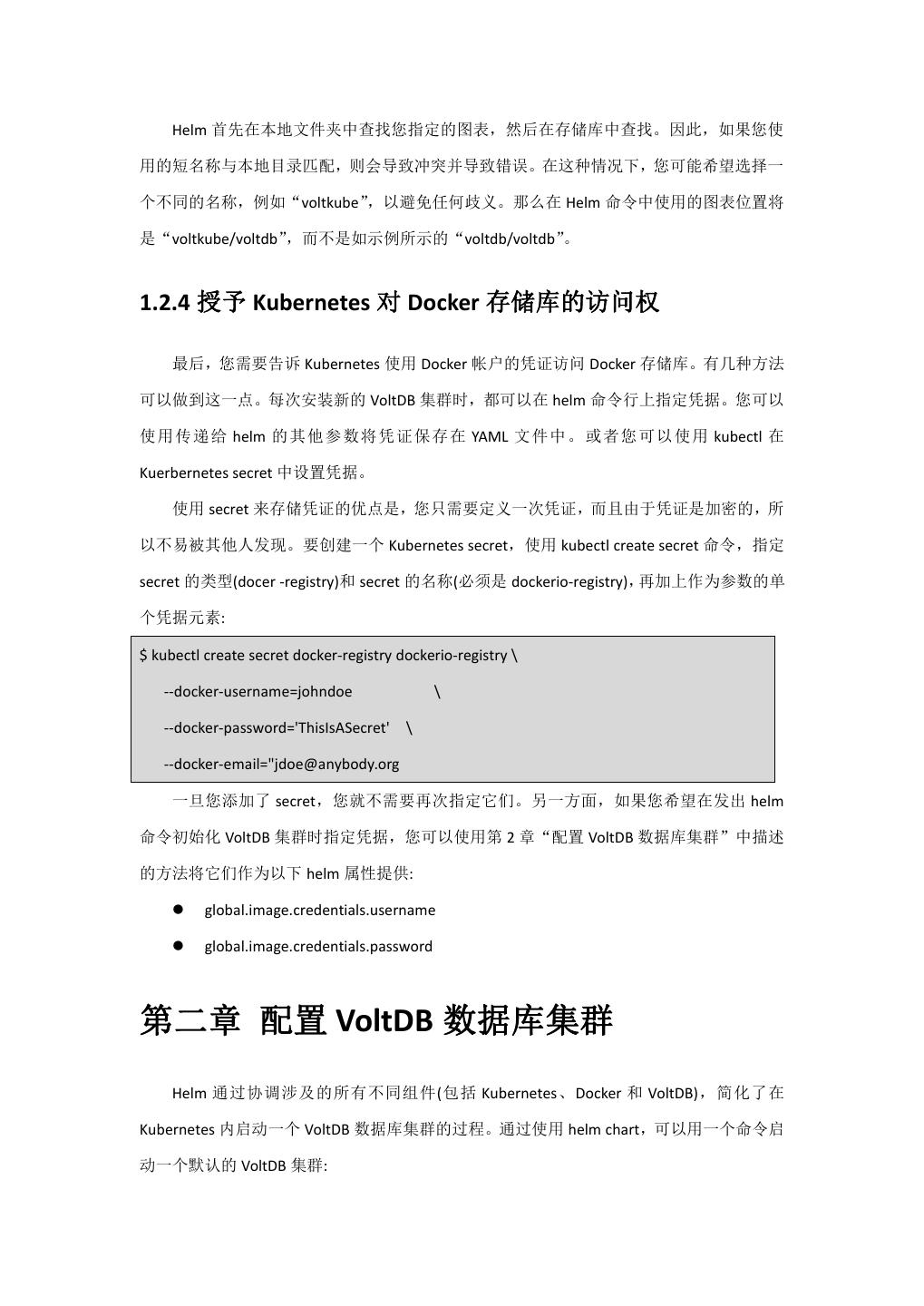 8 . Helm 首先在本地文件夹中查找您指定的图表,然后在存储库中查找。因此,如果您使 用的短名称与本地目录匹配,则会导致冲突并导致错误。在这种情况下,您可能希望选择一 个不同的名称,例如“voltkube”,以避免任何歧义。那么在 Helm 命令中使用的图表位置将 是“voltkube/voltdb”,而不是如示例所示的“voltdb/voltdb”。 1.2.4 授予 Kubernetes 对 Docker 存储库的访问权 最后,您需要告诉 Kubernetes 使用 Docker 帐户的凭证访问 Docker 存储库。有几种方法 可以做到这一点。每次安装新的 VoltDB 集群时,都可以在 helm 命令行上指定凭据。您可以 使 用传 递 给 helm 的 其他 参 数将 凭 证保 存 在 YAML 文 件中 。 或者 您 可以 使 用 kubectl 在 Kuerbernetes secret 中设置凭据。 使用 secret 来存储凭证的优点是,您只需要定义一次凭证,而且由于凭证是加密的,所 以不易被其他人发现。要创建一个 Kubernetes secret,使用 kubectl create secret 命令,指定 secret 的类型(docer -registry)和 secret 的名称(必须是 dockerio-registry),再加上作为参数的单 个凭据元素: $ kubectl create secret docker-registry dockerio-registry \ --docker-username=johndoe \ --docker-password='ThisIsASecret' \ --docker-email="jdoe@anybody.org 一旦您添加了 secret,您就不需要再次指定它们。另一方面,如果您希望在发出 helm 命令初始化 VoltDB 集群时指定凭据,您可以使用第 2 章“配置 VoltDB 数据库集群”中描述 的方法将它们作为以下 helm 属性提供: global.image.credentials.username global.image.credentials.password 第二章 配置 VoltDB 数据库集群 Helm 通过协调涉及的所有不同组件(包括 Kubernetes、Docker 和 VoltDB),简化了在 Kubernetes 内启动一个 VoltDB 数据库集群的过程。通过使用 helm chart,可以用一个命令启 动一个默认的 VoltDB 集群: