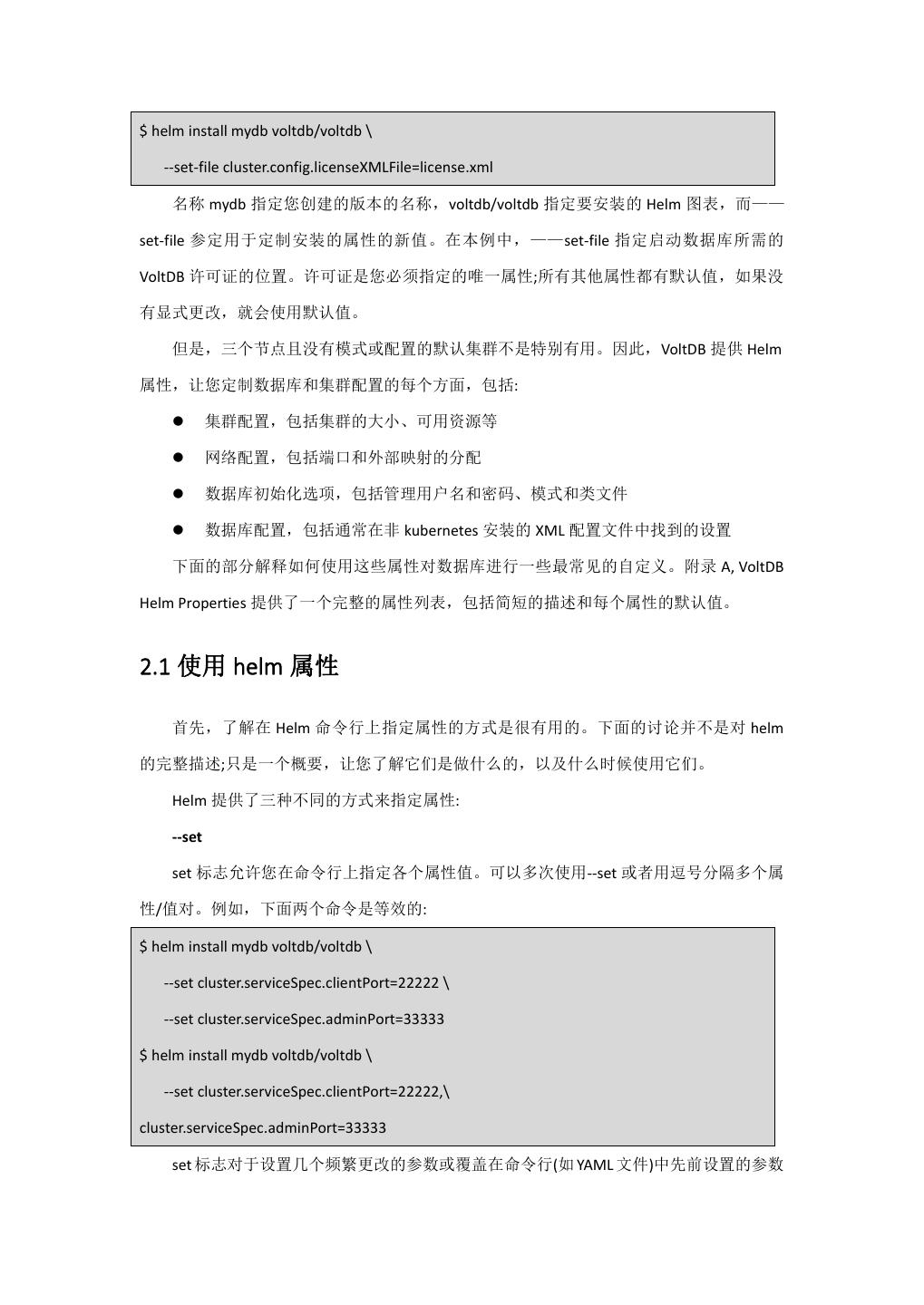 9 .$ helm install mydb voltdb/voltdb \ --set-file cluster.config.licenseXMLFile=license.xml 名称 mydb 指定您创建的版本的名称,voltdb/voltdb 指定要安装的 Helm 图表,而—— set-file 参定用于定制安装的属性的新值。在本例中,——set-file 指定启动数据库所需的 VoltDB 许可证的位置。许可证是您必须指定的唯一属性;所有其他属性都有默认值,如果没 有显式更改,就会使用默认值。 但是,三个节点且没有模式或配置的默认集群不是特别有用。因此,VoltDB 提供 Helm 属性,让您定制数据库和集群配置的每个方面,包括: 集群配置,包括集群的大小、可用资源等 网络配置,包括端口和外部映射的分配 数据库初始化选项,包括管理用户名和密码、模式和类文件 数据库配置,包括通常在非 kubernetes 安装的 XML 配置文件中找到的设置 下面的部分解释如何使用这些属性对数据库进行一些最常见的自定义。附录 A, VoltDB Helm Properties 提供了一个完整的属性列表,包括简短的描述和每个属性的默认值。 2.1 使用 helm 属性 首先,了解在 Helm 命令行上指定属性的方式是很有用的。下面的讨论并不是对 helm 的完整描述;只是一个概要,让您了解它们是做什么的,以及什么时候使用它们。 Helm 提供了三种不同的方式来指定属性: --set set 标志允许您在命令行上指定各个属性值。可以多次使用--set 或者用逗号分隔多个属 性/值对。例如,下面两个命令是等效的: $ helm install mydb voltdb/voltdb \ --set cluster.serviceSpec.clientPort=22222 \ --set cluster.serviceSpec.adminPort=33333 $ helm install mydb voltdb/voltdb \ --set cluster.serviceSpec.clientPort=22222,\ cluster.serviceSpec.adminPort=33333 set 标志对于设置几个频繁更改的参数或覆盖在命令行(如 YAML 文件)中先前设置的参数