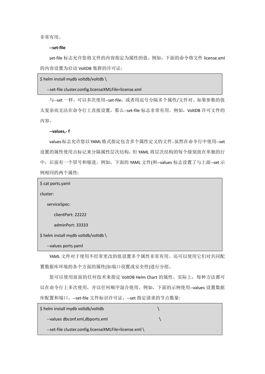 10 .非常有用。 --set-file set-file 标志允许您将文件的内容指定为属性的值。例如,下面的命令将文件 license.xml 的内容设置为启动 VoltDB 集群的许可证: $ helm install mydb voltdb/voltdb \ --set-file cluster.config.licenseXMLFile=license.xml 与--set 一样,可以多次使用--set-file,或者用逗号分隔多个属性/文件对。如果参数的值 太复杂而无法在命令行上直接设置,那么--set-file 标志非常有用。例如,VoltDB 许可文件的 内容。 --values,- f values 标志允许您以 YAML 格式指定包含多个属性定义的文件。 虽然在命令行中使用--set 设置的属性使用点标记来分隔属性层次结构,但 YAML 将层次结构的每个级别放在单独的行 中,后面有一个冒号和缩进。例如,下面的 YAML 文件(和--values 标志设置了与上面--set 示 例相同的两个属性: $ cat ports.yaml cluster: serviceSpec: clientPort: 22222 adminPort: 33333 $ helm install mydb voltdb/voltdb \ --values ports.yaml YAML 文件对于使用不经常更改的值设置多个属性非常有用。还可以使用它们对共同配 置数据库环境的各个方面的属性(如端口设置或安全性)进行分组。 您可以使用前面的任何技术来指定 VoltDB Helm Chart 的属性。实际上,每种方法都可 以在命令行上多次使用,并以任何顺序混合使用。例如,下面的示例使用--values 设置数据 库配置和端口,--set-file 文件标识许可证,--set 指定请求的节点数量: $ helm install mydb voltdb/voltdb \ --values dbconf.xml,dbports.xml \ --set-file cluster.config.licenseXMLFile=license.xml \
