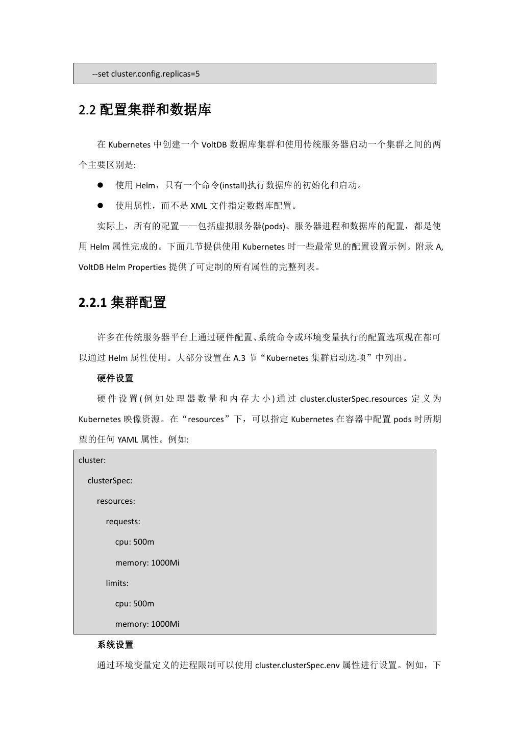 11 . --set cluster.config.replicas=5 2.2 配置集群和数据库 在 Kubernetes 中创建一个 VoltDB 数据库集群和使用传统服务器启动一个集群之间的两 个主要区别是: 使用 Helm,只有一个命令(install)执行数据库的初始化和启动。 使用属性,而不是 XML 文件指定数据库配置。 实际上,所有的配置——包括虚拟服务器(pods)、服务器进程和数据库的配置,都是使 用 Helm 属性完成的。下面几节提供使用 Kubernetes 时一些最常见的配置设置示例。附录 A, VoltDB Helm Properties 提供了可定制的所有属性的完整列表。 2.2.1 集群配置 许多在传统服务器平台上通过硬件配置、系统命令或环境变量执行的配置选项现在都可 以通过 Helm 属性使用。大部分设置在 A.3 节“Kubernetes 集群启动选项”中列出。 硬件设置 硬 件 设 置 ( 例 如 处 理 器 数 量 和 内 存 大 小 ) 通 过 cluster.clusterSpec.resources 定 义 为 Kubernetes 映像资源。在“resources”下,可以指定 Kubernetes 在容器中配置 pods 时所期 望的任何 YAML 属性。例如: cluster: clusterSpec: resources: requests: cpu: 500m memory: 1000Mi limits: cpu: 500m memory: 1000Mi 系统设置 通过环境变量定义的进程限制可以使用 cluster.clusterSpec.env 属性进行设置。例如,下