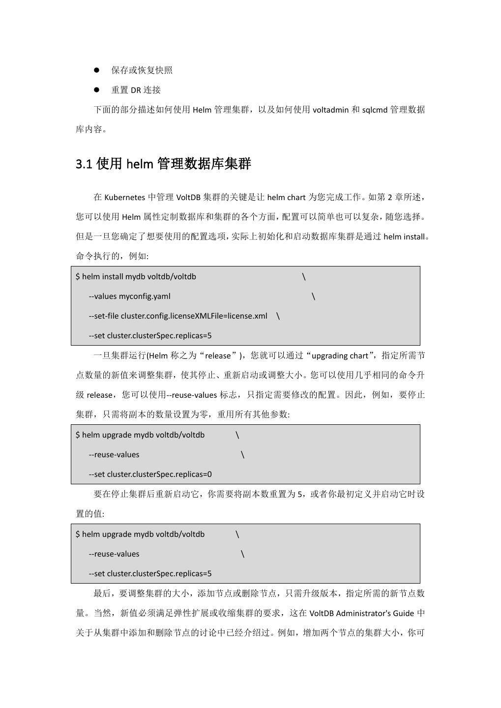 16 . 保存或恢复快照 重置 DR 连接 下面的部分描述如何使用 Helm 管理集群,以及如何使用 voltadmin 和 sqlcmd 管理数据 库内容。 3.1 使用 helm 管理数据库集群 在 Kubernetes 中管理 VoltDB 集群的关键是让 helm chart 为您完成工作。如第 2 章所述, 您可以使用 Helm 属性定制数据库和集群的各个方面,配置可以简单也可以复杂,随您选择。 但是一旦您确定了想要使用的配置选项,实际上初始化和启动数据库集群是通过 helm install。 命令执行的,例如: $ helm install mydb voltdb/voltdb \ --values myconfig.yaml \ --set-file cluster.config.licenseXMLFile=license.xml \ --set cluster.clusterSpec.replicas=5 一旦集群运行(Helm 称之为“release”),您就可以通过“upgrading chart”,指定所需节 点数量的新值来调整集群,使其停止、重新启动或调整大小。您可以使用几乎相同的命令升 级 release,您可以使用--reuse-values 标志,只指定需要修改的配置。因此,例如,要停止 集群,只需将副本的数量设置为零,重用所有其他参数: $ helm upgrade mydb voltdb/voltdb \ --reuse-values \ --set cluster.clusterSpec.replicas=0 要在停止集群后重新启动它,你需要将副本数重置为 5,或者你最初定义并启动它时设 置的值: $ helm upgrade mydb voltdb/voltdb \ --reuse-values \ --set cluster.clusterSpec.replicas=5 最后,要调整集群的大小,添加节点或删除节点,只需升级版本,指定所需的新节点数 量。当然,新值必须满足弹性扩展或收缩集群的要求,这在 VoltDB Administrator's Guide 中 关于从集群中添加和删除节点的讨论中已经介绍过。例如,增加两个节点的集群大小,你可